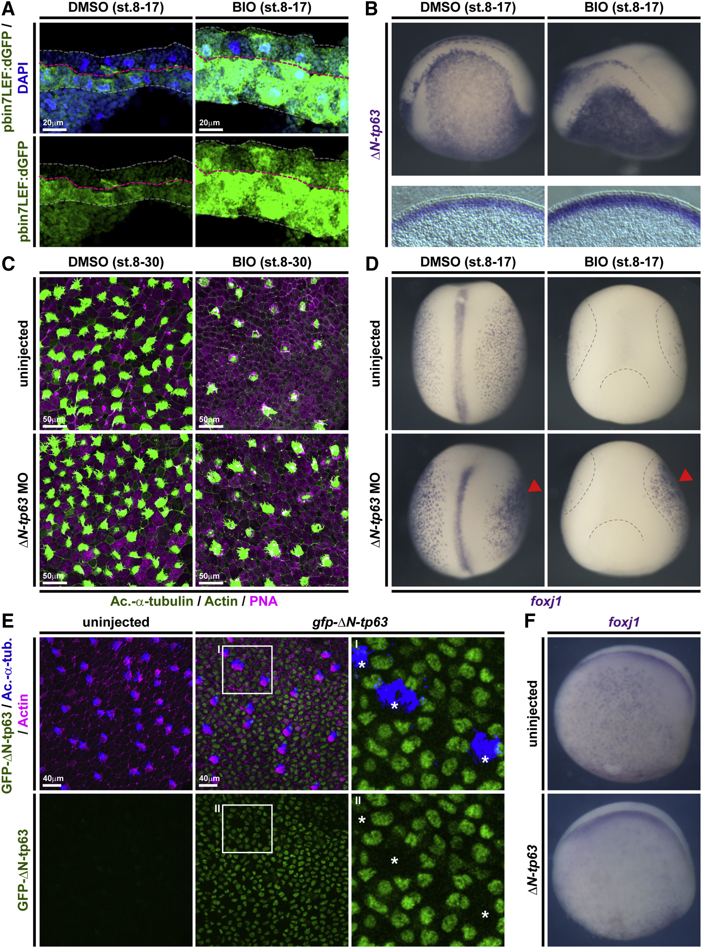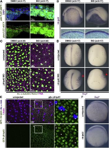 Figure 3. ÎN-tp63 Mediates Wnt/β-Catenin-Induced Inhibition of Cell Fate Specification in Xenopus (AâD) BIO treatments from st. 8â17 or st. 8â30. DMSO was used as vehicle control. (A) Confocal imaging shows Wnt/β-catenin signaling activation (green) and thickening of the epidermis in BIO-treated embryos. Nuclei (DAPI, blue). DMSO (n = 2); BIO (n = 2). (B) In situ hybridization (ISH) shows increased intensity and thickness of the ÎN-tp63 expression domain in BIO-treated whole mounts (upper row) and transversal sections (bottom row). (C) BIO treatment reduces MCC (Ac.-α-tubulin, green), Ionocyte (no staining, black), and SSC (large vesicles, peanut agglutinin [PNA] staining, magenta) numbers in confocal micrographs. Actin staining (green). ÎN-tp63 MO in controls leads to increased MCCs and Ionocytes, while ÎN-tp63 MO in BIO-treated embryos rescues MCC and Ionocyte formation. (D) ISH reveals reduced MCC numbers (foxj+ cells) after BIO treatment, while unilateral knockdown of ÎN-tp63 in control treated embryos leads to more foxj+ cells and rescues foxj+ cell numbers in BIO-treated embryos. DMSO (n = 5); BIO (n = 7); DMSO+ÎN-tp63 MO (n = 5); BIO+ÎN-tp63 MO (n = 4). Injected side is indicated by red arrowhead. Dashed lines indicate epidermal area in BIO-treated embryos. (E) Overexpression of gfp-ÎN-tp63 mRNA leads to nuclear localization of the protein (green) and reduced MCC (Ac.-α-tubulin, blue) numbers at st. 30. Actin staining (magenta). Differentiated MCCs in injected specimens show no nuclear GFP signal (asterisks), indicating that they were not targeted. Magnified areas IâII are indicated. (F) ISH for foxj1 at st. 17 shows reduced MCCs in ÎN-tp63 mRNA injected embryos. Related to Figures S2 and S3. |