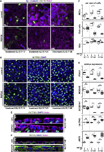 Figure 4. Wnt/β-Catenin Signaling Inhibits Differentiation and Promotes Stemness in Human BCs (AâF) Human immortalized BC (BCIs) kept in air-liquid interface (ALI) culture for up to 4 weeks. Human recombinant R-spondin2 (RSPO2) was used to activate Wnt/β-catenin signaling starting at ALI day 7 (D7). n = 3 cultures per time point and treatment. (A) Confocal imaging of specimens stained for Ac.-α-tubulin (MCCs, blue), CC10 (Club cells, green), and Actin (cell membranes, magenta) show reduced MCC and Club cell numbers in RSPO2-treated cultures. (B) RSPO2 does not reduce the number of ÎN-TP63+ (green) cells. Nuclei (DAPI, blue). (C) Quantification from (A) and (B). Mann Whitney test, not significant, ns (p > 0.05); âp ⤠0.05; ââp ⤠0.01; âââp ⤠0.001. (D) Quantitative real-time PCR. Expression levels are depicted relative to stage controls. RSPO2 reduces expression of MCC (FOXJ1, MCIDAS) and Club cell (SCGB1A1) markers but increases expression of BC markers (ÎN-TP63, KRT5). Studentâs t test, not significant, ns (p > 0.05); âp ⤠0.05; ââp ⤠0.01; âââp ⤠0.001. (E and F) Optical orthogonal sections of confocal images. RSPO2-treated cultures display increased epithelial thickness and cells staining for BC markers ÎN-TP63 (green, in E) and KRT5 (green, in F). Related to Figure S4. |