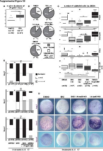 Splemental Figure S2: Analysis and quantification of gain of Wnt/β-Catenin and δN-tp63 functions in Xenopus, Related to Figure 3. (A) Quantification of results depicted in Figure 2B. (B,C) Quantification of results depicted in Figure 2C. In (A,C) Mann Whitney test, not significant, ns = P>0.05; * = Pâ¤0.05; ** = Pâ¤0.01; *** = Pâ¤0.001. (D) ISH for cell type markers foxj (MCCs), foxi1 (Ionocytes) and foxa1 (SSCs) in embryos at after BIO incubation during st. 8-17, DMSO control treatment, δN-tp63 MO injections, and BIO + δN-tp63 MO. All embryos are depicted in ventral view with anterior up. Related to Figure 2D. (E) Quantification of ISH results from (D). Chi-squared test, not significant, ns = P>0.05; * = Pâ¤0.05; ** = Pâ¤0.01; *** = Pâ¤0.001. |