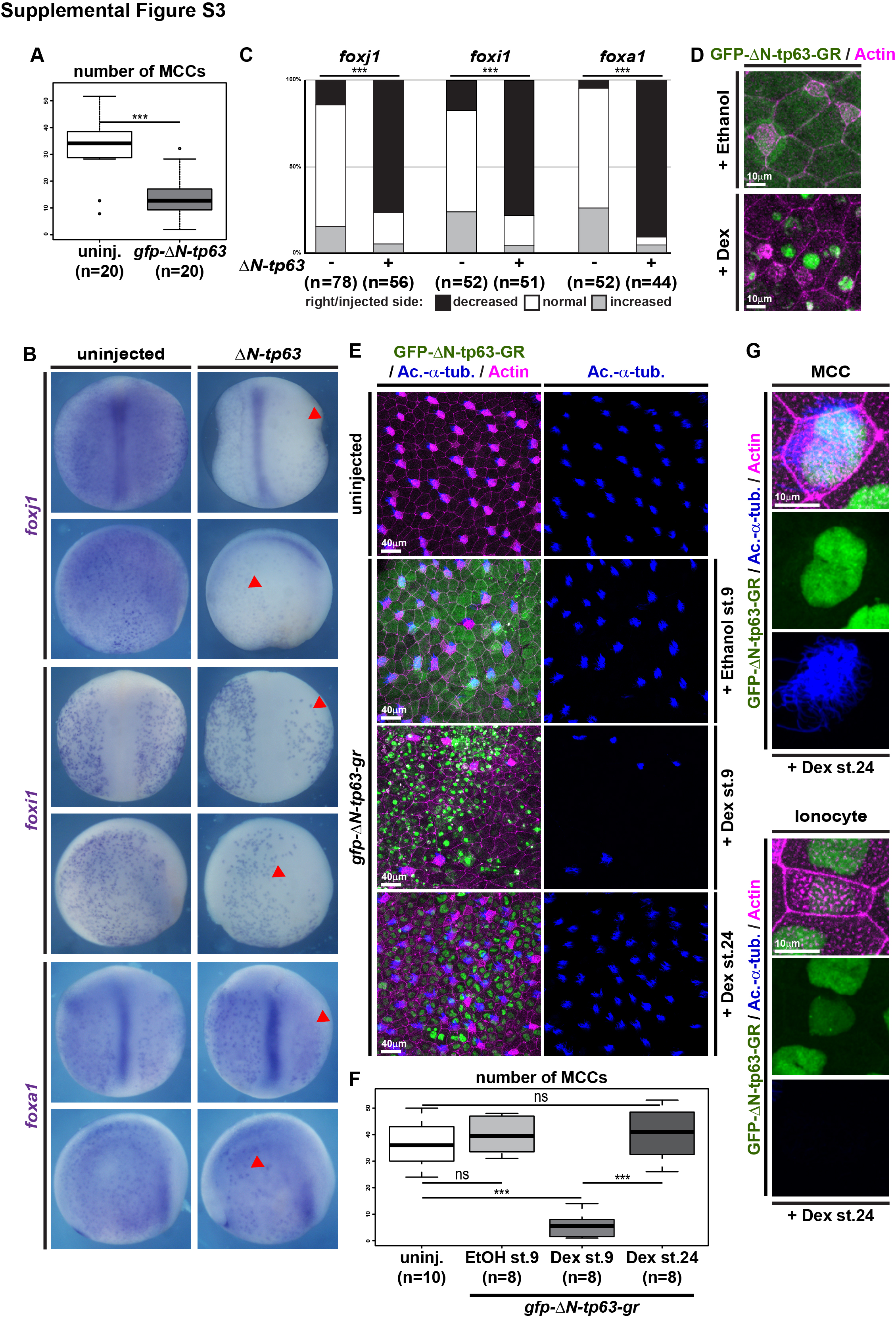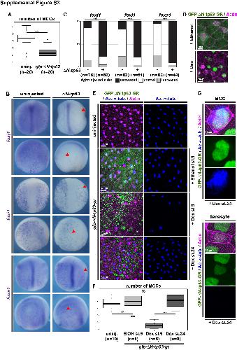 Supplemental Figure S3: Analysis and quantification of δN-tp63 gain-of-function effects in Xenopus, Related to Figure 3 (A) Quantification of results depicted in Figure 2E. Mann Whitney test, *** = Pâ¤0.001. (B) ISH for cell type markers foxj (MCCs), foxi1 (Ionocytes) and foxa1 (SSCs) in embryos injected unilaterally with δN-tp63 mRNA. Injected side is indicated by red arrowheads. Dorsal views are shown in upper panels, lateral views are shown in the lower panels. (C) Quantification of results depicted in (B). Chi-squared test, *** = Pâ¤0.001. (D-G) Confocal images of embryos injected with GFP- δN-tp63 -GR mRNA (green) and stained for MCCs (Ac.-α-tubulin, blue) and cell membranes (Actin, magenta). (D) Only Dex-activated GFP-δN-tp63-GR localizes to the nucleus. (E) Activation of the construct at st. 9 inhibits MCC formation, but not activation at st. 24 or vehicle treatment (Ethanol). (F) Quantification of results shown in (E). Mann Whitney test, not significant, ns = P>0.05; *** = Pâ¤0.001. (G) Magnified views of fully differentiated MCC and Ionocyte with nuclear GFP-δN--tp63-GR after activation at st. 24. |