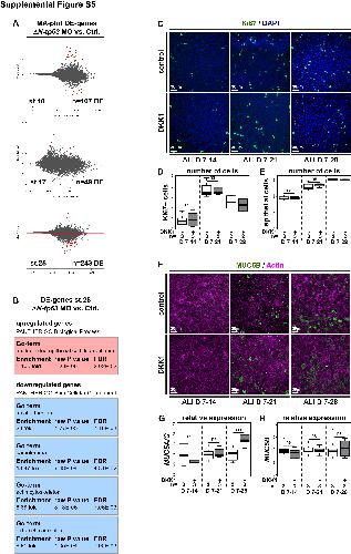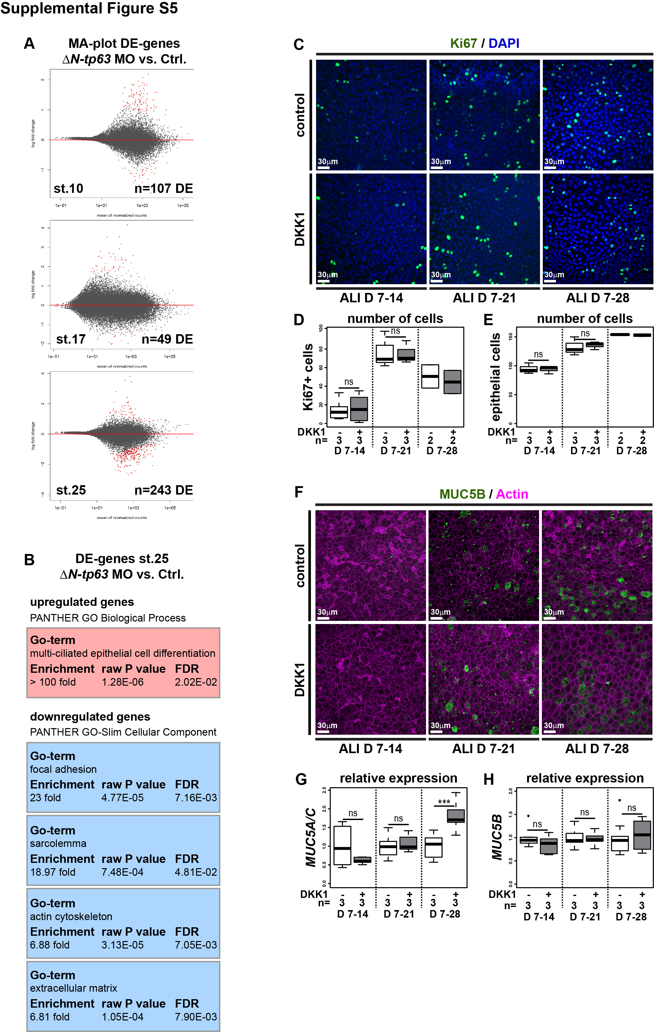 Supplemental Figure S5: RNA-sequencing in Xenopus mucociliary organoids and analysis of loss of Wnt/β-Catenin effects in BCIs, Related to Figure 5 and 6 (A) MA-plots generated by DEseq2 analysis of differential expression changes in RNA-sequencing data at st.10, 17 and 25 on Xenopus mucociliary organoids comparing controls to δN-tp63 MO injected. N=3 per stage and treatment. Stage and number of differentially expressed genes are indicated. Red dots represent differentially expressed genes, black dots are not significantly differently expressed. (B) GO-term analysis of differentially upregulated (red box) and downregulated (blue boxes) genes at st. 25. Significantly enriched terms are depicted, including fold enrichment of term representation, P value, and false discovery rate (FDR). (C-H) Human BCIs cultured in ALI conditions for up to 4 weeks. DKK1 was used to inhibit Wnt/β-Catenin signaling starting at ALI day 7 (D7). N cultures per timepoint and treatment are indicated. (C) Ki67 (green) staining reveals proliferating cells. Nuclei are stained with DAPI (blue). (D) Quantification of results depicted in (C). Mann Whitney test, not significant, ns = P>0.05. (E) Quantification of epithelial cell numbers. Related to Figure 5A. Mann Whitney test, not significant, ns = P>0.05. (F) MUC5B (green) staining reveals no increase or loss of Goblet cell numbers in the epithelium of DKK1-treated cultures. Actin (cell membranes, magenta). (G,H) qPCR expression levels are depicted relative to stage controls. DKK1 increases expression of Goblet cell marker MUC5A/C (G), but has no effect on expression of the Goblet marker MUC5B (H).Studentâs t-test, not significant, ns = P>0.05; *** = Pâ¤0.001. Related to Figure 3D. |