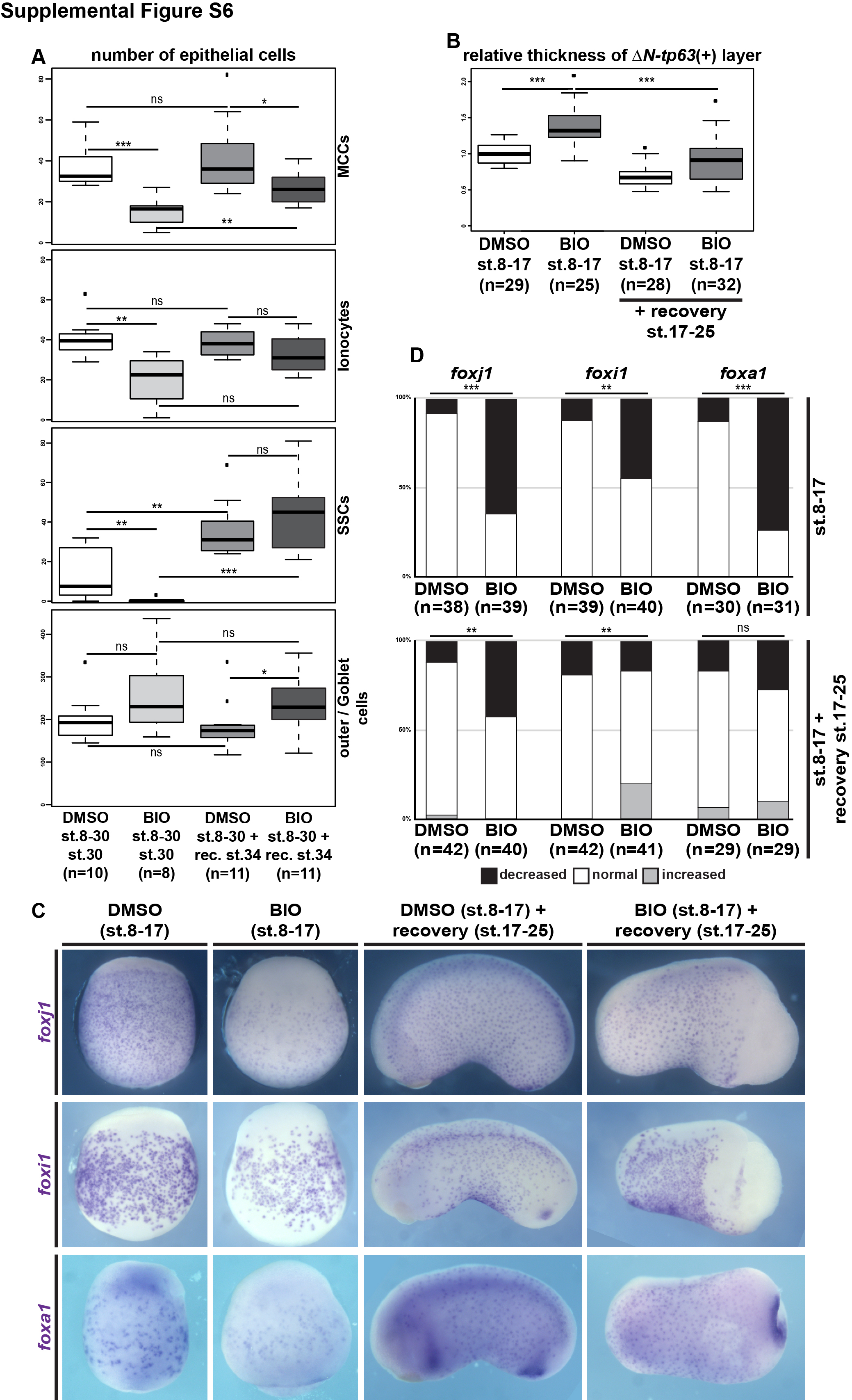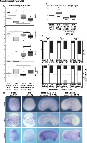 Supplemental Figure S6: Analysis and quantification of regeneration experiments in Xenopus, Related to Figure 7 (A) Quantification of results depicted in Figure 6A. (B) Quantification of results depicted in Figure 6B. In (A,B) Mann Whitney test, ns = P>0.05; * = Pâ¤0.05; ** = Pâ¤0.01; *** = Pâ¤0.001. (C) ISH for cell type markers foxj (MCCs), foxi1 (Ionocytes) and foxa1 (SSCs) in embryos after BIO incubation during st. 8-17 or DMSO control treatment at st. 17, and at st. 25 after recovery during st. 17-25. St. 17 embryos are depicted in ventral view with anterior up, st. 25 embryos are depicted in lateral view with anterior to the left. Related to Figure 6B. (D) Quantification of results depicted in (C). Chi-squared test, ns = P>0.05; * = Pâ¤0.05; ** = Pâ¤0.01; *** = Pâ¤0.001. |
