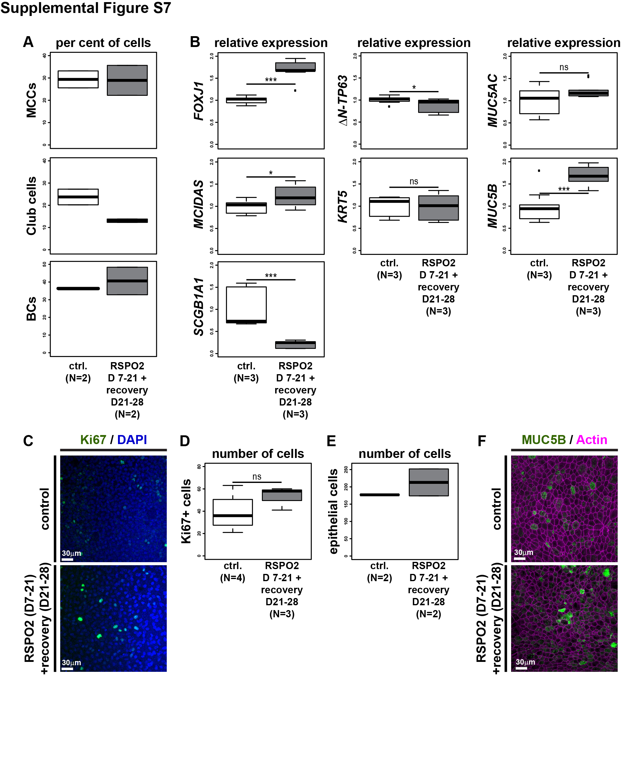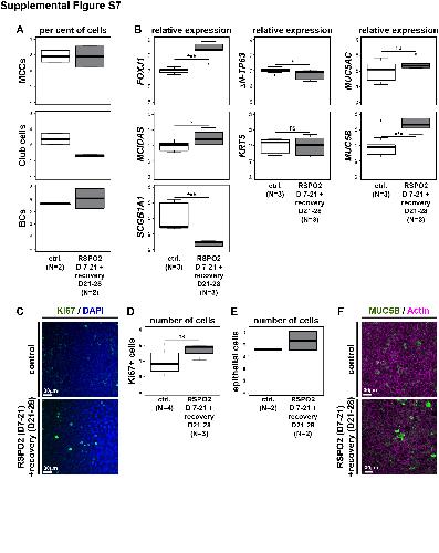 Supplemental Figure S7: Analysis and quantification of regeneration experiments in BCIs, Related to Figure 7 (A-F) Human BCIs cultured in ALI conditions for up to 4 weeks. RSPO2 was used to activate Wnt/β-Catenin signaling starting at ALI day 7 (D7) until ALI D21 (D21). After treatment, RSPO2 was removed from the medium and cultures were allowed to recover for 7 days. Number of cultures per treatment are indicated. (A) Quantification of results depicted in Figure 6C. (B) qPCR expression levels are depicted relative to stage controls. Studentâs t-test, not significant, ns = P>0.05; * = Pâ¤0.05; *** = Pâ¤0.001. Related to Figure 6C. (C) Ki67 (green) staining reveals proliferating cells. Nuclei are stained with DAPI (blue). (D) Quantification of results depicted in (C). Mann Whitney test, ns = P>0.05. (E) Quantification of epithelial cell numbers. Related to Figure 6C. (F) MUC5B (green) staining reveals Goblet cells in the epithelium. Actin (cell membranes, magenta). |