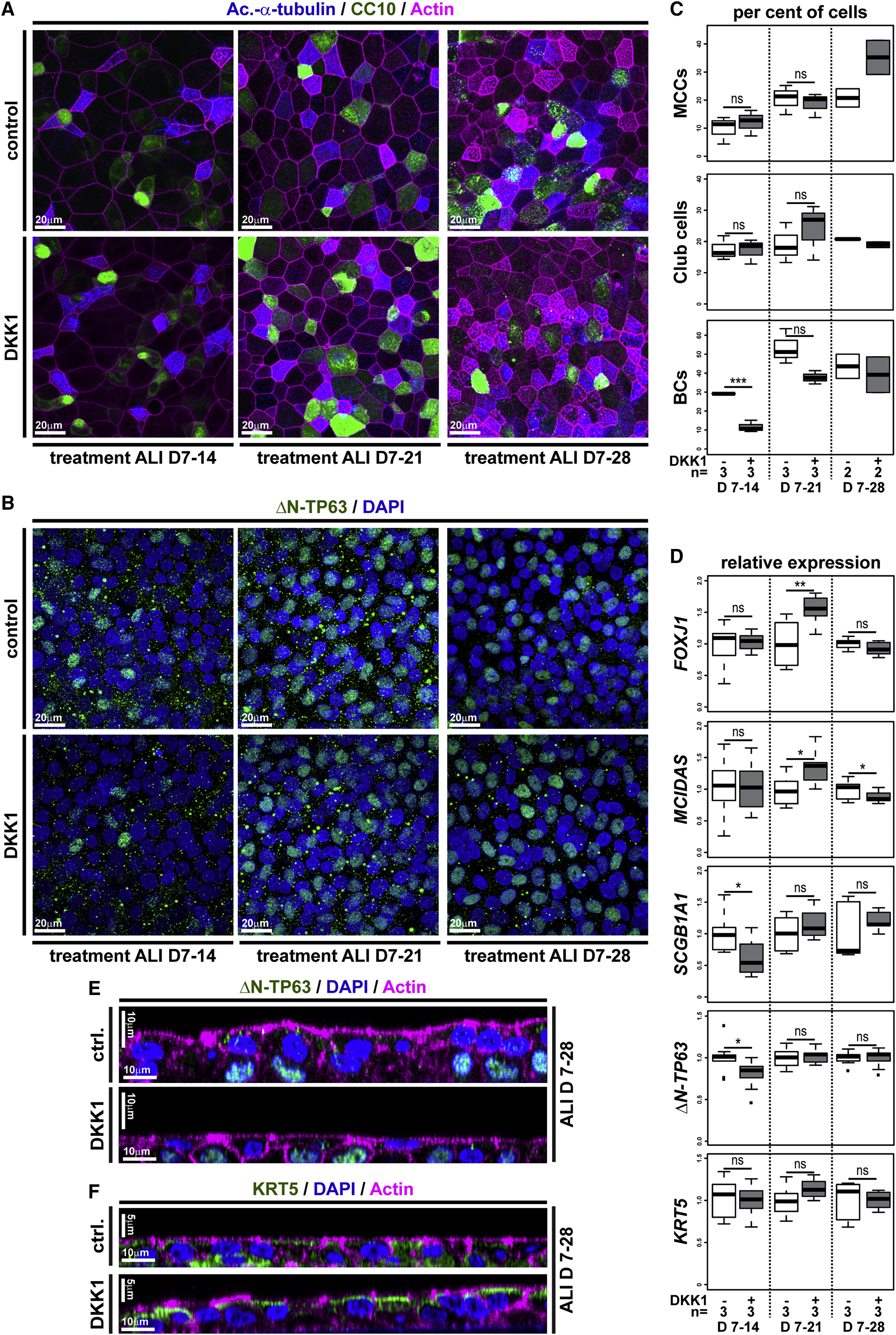Figure 6. Inhibition of Wnt/β-Catenin Signaling Transiently Reduces Stemness and Promotes Differentiation in Human BCs (AâF) BCIs in ALI culture for up to 4 weeks. Human recombinant DKK1 (DKK1) was used to inhibit Wnt/β-catenin signaling starting at ALI day 7 (D7). (A) Confocal imaging of specimens stained for Ac.-α-tubulin (MCCs, blue), CC10 (Club cells, green), and Actin (cell membranes, magenta) shows moderately increased MCC and Club cell numbers after DKK1 treatment. (B) DKK1 leads to a transient decrease in BCs but does not lead to loss of ÎN-TP63+ (green) cells. Nuclei (DAPI, blue). (C) Quantification from (A) and (B), respectively. Mann Whitney test, not significant, ns (p > 0.05); âââp ⤠0.001. (D) Quantitative real-time PCR expression levels are depicted relative to stage controls. DKK1 increases expression of MCC (FOXJ1, MCIDAS) and to a lesser extent Club cell (SCGB1A1) markers but without reduction of BC markers (ÎN-TP63, KRT5). Studentâs t test, not significant, ns (p > 0.05); âp ⤠0.05; ââp ⤠0.01. (E and F) Optical orthogonal sections of confocal images after staining for BC markers ÎN-TP63 (green, in E) and KRT5 (green, in F). Related to Figure S5. |