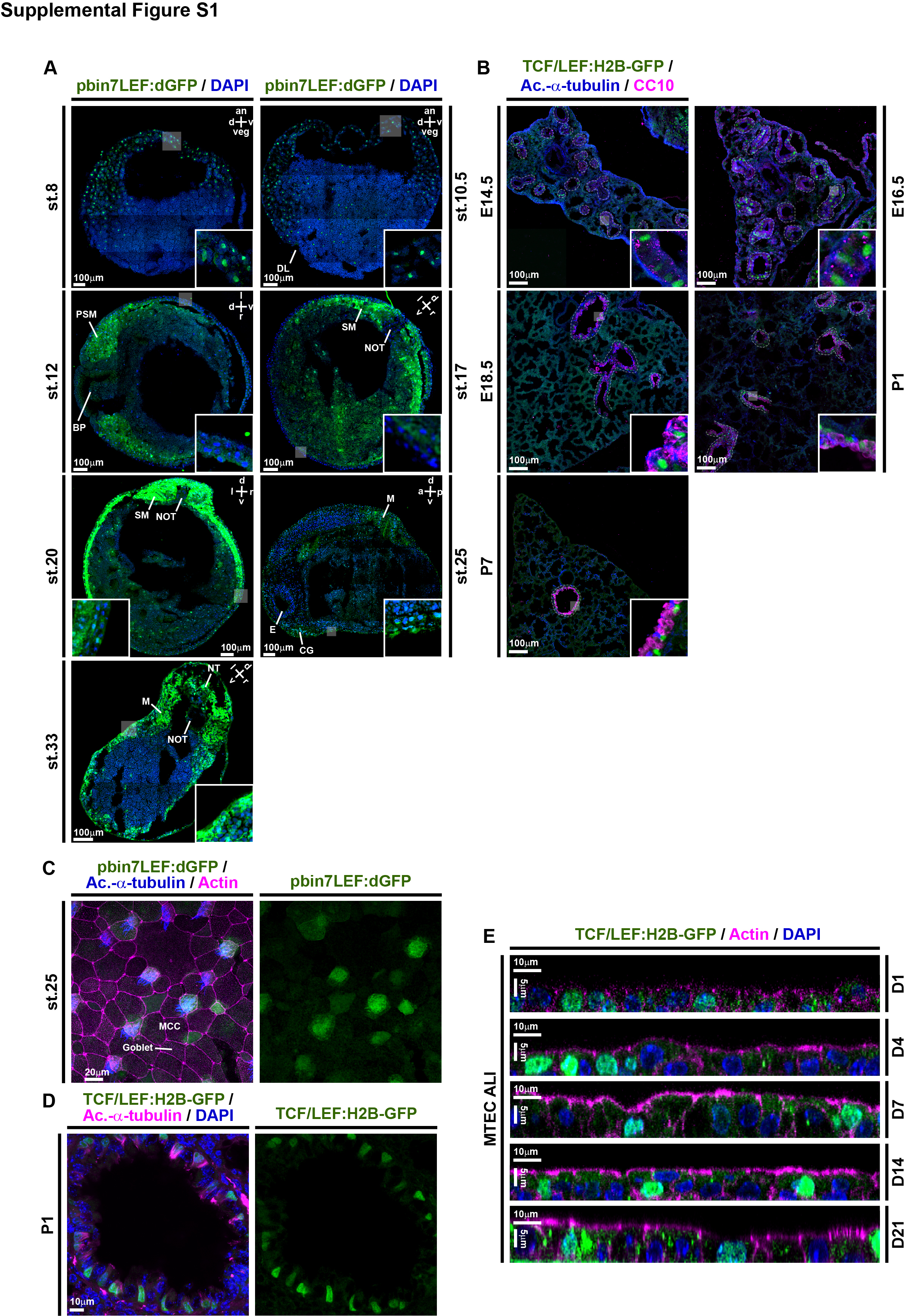 Supplemental Figure S1: Wnt/β-Catenin signaling in the Xenopus mucociliary epidermis and in airway cells of the mouse, Related to Figure 1 (A-B) Reconstructed confocal tile-scans of sectioned Xenopus and mice tissues. (A) Analysis of Wnt/β-Catenin activity in X. laevis whole embryo sections using the pbin7LEF:dGFP reporter line (green; signal was enhanced by anti-GFP immunofluorescent staining). Nuclei are stained by DAPI (blue). Embryonic stages (st. 8-33) are indicated. Orientation of embryos is indicated in the upper-right corner of color-merged micrographs. an = animal; veg = vegetal; d = dorsal; v = ventral; l = left; r = right. Embryonic structures are indicated. DL = dorsal blastopore lip; PSM = presomitic mesoderm; BP = blastopore; SM = somatic mesoderm; NOT = notochord; M = muscles; E = eye; CG = cement gland; NT = neural tube. Magnified areas are highlighted in color-merged micrographs. (B) Analysis of Wnt/β-Cateninactivity in the developing mouse airway mucociliary epithelium using the TCF/LEF:H2B-GFP reporter line (green). MCCs are marked by Acetylated-alpha-tubulin (Ac.-alpha-tubulin, blue) and Club cells are marked by CC10 (magenta) staining. Dashed lines outline the epithelium. Embryonic (E14.5-18.5) / post-natal (P1-7) stages are indicated. Magnified areas are highlighted. Note that GFP signals are largely restricted to epithelia of bronchi and bronchioles. (C) En-face imaging of the Xenopus epidermis at st. 25 shows elevated signaling levels (green) in intercalating MCCs (Ac.-alpha-tubulin, blue) and Ionocytes, but not in outer layer-derived Goblet cells. Cell membranes are visualized by Actin staining (magenta). (D) Magnified view of a P1 Wnt-reporter (green) bronchiole stained for Ac.-alpha-tubulin (magenta) and DAPI (blue) depicting multiple differentiating MCCs with elevated Wnt signaling. Related to Figure 1E. (E) MTEC ALI cultures generated from the TCF/LEF:H2B-GFP reporter line (green) and cultured up to 21 days (D21) revealed Wnt signaling activity throughout the different stages. N=3 cultures per timepoint. Optical orthogonal sections of confocal images of Wnt reporter (green) MTECs at the indicated ALI day stained for Actin (magenta), nuclei (DAPI, blue). |