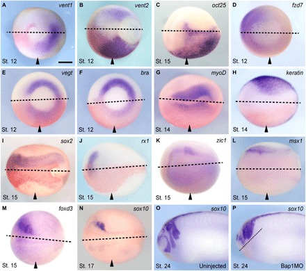 Fig. 2. Bap1 loss deregulates expression of pluripotency and lineage commitment genes.(A to P) Representative embryos injected with 7.5 ng of the Bap1MO morpholino into one blastomere at the two-cell stage (arrowheads indicate injected side) and then fixed and analyzed for mRNA expression of the indicated developmental genes by WISH at the specified stages (gastrula, stage 12; midneurula, stages 14 to 17; early tail bud, stage 24). Bap1-depleted embryos fail to silence pluripotency factors such as vent1/2 (orthologs of mammalian Nanog) and oct25 (ortholog of mammalian Oct4) (A to C) and fail to activate lineage commitment factors such as fzd7 (dorsal mesoderm and ectoderm), vegT and bra (axial mesoderm), myoD (muscle), keratin1 (non-neural ectoderm), sox2 (neural ectoderm), rx1 (early eye field), zic1 and msx1 (neural fold/prospective neural crest), and foxD3 and sox10 (neural crest) (D to N). Bap1 loss results in a failure of neural crest cell migration in sox10-expressing cells compared to the uninjected control (O and P). Panels show the dorsal-caudal view (A, B, and D to F), the dorsal view (C and G to N), or the lateral view (O and P), anterior side left. Dotted lines indicate midline. Arrowheads indicate injected side. Scale bar, 250 μm.
