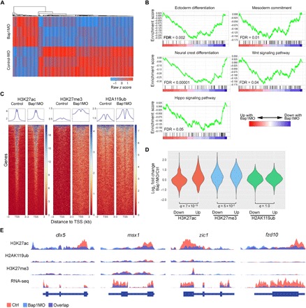 Fig. 3. Loss of Bap1 abrogates the assembly of H3K27ac at promoters of key genes regulating lineage commitment and differentiation.(A) Heat map demonstrating the top 1000 most differentially expressed genes by RNA-seq between embryos at one-cell stage with 15 ng of either Bap1MO or Bap1MO-Ctrl and collected at late gastrulation (stage 12), when morphologic effects of Bap1 loss are first evident. (B) Gene set enrichment analysis (GSEA) plots demonstrating the most highly significant pathways represented by the differentially expressed genes associated with Bap1 loss. FDR, false discovery rate. (C) Heat maps of ChIP-seq data demonstrating global genomic occupancy of the indicated histone marks across all annotated genes in embryos treated as above with either Bap1MO or Bap1MO-Ctrl. TSS, transcription start site. (D) Violin plots summarizing ChIP-seq data restricted to differentially expressed genes. (E) ChIP-seq and RNA-seq tracks of representative lineage commitment genes that fail to assemble H3K27ac at promoters and to activate mRNA expression in Bap1-deficient embryos.