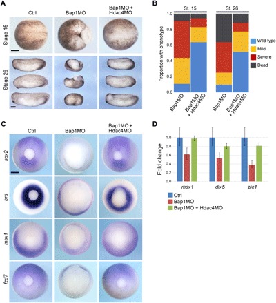 Fig. 4. Hdac4 is a key mediator of the Bap1-deficient phenotype.(A) Representative embryos injected at the one-cell stage with 7.5 ng of Bap1MO with or without 16 ng of a morpholino directed against Hdac4 (Hdac4MO) and analyzed at midneurula stage (stage 15, dorsal view, anterior to left) and early tail bud stage (stage 26, lateral view, anterior to left). (B) Summary of results at stages 15 and 26, showing substantial rescue of the Bap1-deficient phenotype with Hdac4MO. (C) Representative embryos treated as above and analyzed by WISH, demonstrating that failed induction of the indicated developmental genes in Bap1-deficient embryos is rescued by Hdac4MO. Caudal view, dorsal up. (D) ChIPâquantitative polymerase chain reaction (qPCR) for indicated gene promoters following ChIP for H3K27ac, confirming that failure to assemble H3K27ac at promoters in Bap1-deficient embryos can be rescued by depletion of Hdac4. Scale bars, 250 μm.
