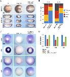 Fig. 1. Loss of Bap1 during Xenopus development produces a distinctive phenotype.(A) Representative embryos analyzed at late gastrula (stage 12) following injection into one blastomere at the two-cell stage of escalating doses (7.5, 10, and 20 ng) of a morpholino targeting the 5â²UTR of bap1 mRNA (Bap1MO) or a bap1 base pair mismatch control morpholino (Bap1MO-Ctrl). Below each bright-field image is a corresponding fluorescence image demonstrating fluorescein isothiocyanate as a lineage tracer for the injected side (green color). Depletion of Bap1 produces gastrulation failure, as evidenced by incomplete blastopore closure (arrows). Arrowheads indicate injected side. Panels show dorsal view, anterior down. (B) Summary of results of experiments described in (A), showing that depletion of Bap1 produces gastrulation failure ranging from mild (yellow) to severe (red) in a dose-dependent manner. (C) Representative embryos treated as above with 7.5 ng of Bap1MO, which eventually completed gastrulation and developed axial foreshortening and bending (arrow) starting at early tail bud stages, compared to uninjected sibling embryos. Panels show lateral view, anteriorleft, except the lower right panel, which shows dorsal view, anterior down. (D) Representative embryos treated as above with 7.5 ng of Bap1MO, which eventually completed gastrulation and were evaluated at stage 37 or 45, showing microphthalmia or anophthalmia (black arrows) starting at late tail bud stages, and proliferation of morphologically immature melanoblasts with altered migration pattern (red arrows) starting at late tail bud and early tadpole stages. Panels show lateral view (except panels labeled dorsal view), anteriorleft. Arrowheads indicate the injected side. (E) Transverse sections through the head of a representative earlyâtadpole stage embryo stained with hematoxylin and eosin, following injection into one blastomere (D1.2) at the 16-cell stage with 7.5 ng of Bap1MO, showing disruption of eye development on the side injected with Bap1MO (right side, arrowhead), compared to normal eye development on the uninjected control side (left side). Dotted line indicates midline. (F) Normal histologic appearance of the eye at earlyâtadpole stage embryo [same orientation as (E)], with ocular structures indicated. RPE, retinal pigment epithelium. (G to I) Representative eyes at late tail bud/earlyâtadpole stage embryos showing mild (G), moderate (H), and severe (I) ocular malformation associated with injection of 7.5 ng of Bap1MO into blastomere D1.2 (which gives rise to retina, lens, and other eye structures) at the 16-cell stage. In severe cases, such as the example in (I), retinal tissue does not form, and the eye remains filled with yolk platelets (pink). (J) Whole-mount in situ hybridization (WISH) of indicated eye markers in embryos injected with 7.5 ng of Bap1MO and a lineage tracer into D1.2 at the 16-cell stage and analyzed at the indicated stages, showing aberrant development of ocular tissues in the absence of Bap1. Markers include ventx2 (dorsal retina, unaffected), pax2 (ventral optic stalk), mitfα and dct [retinal pigment epithelium and uveal melanocytes (UMCs)], rx1 (ciliary marginal zone and photoreceptor), otx2 and rbpms (retinal ganglion cell layer), and α-crystallin (lens). Panels show lateral view, anterior side left. Uninj., uninjected. St., stage. Scale bars, 250 μm.