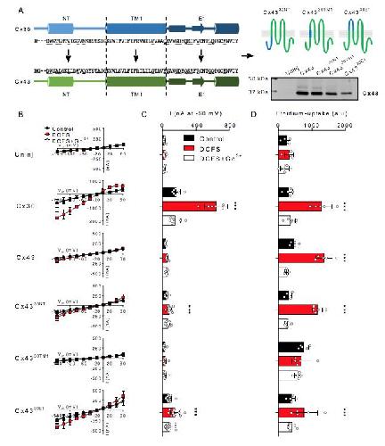 Fig. 3. Cx43 chimera with the predicted pore-lining region of Cx30 display no ion conductance or ethidium uptake. A: Alignment of the N-terminus (NT), transmembrane region 1 (TM1), and extracellular loop 1 (E1) of Cx30 and Cx43 with the predicted pore-lining residues underlined in the amino acid sequence as well as an illustration of Cx43 chimera containing the predicted pore-lining region of Cx30. Western blot of oocyte surface expression of Cx43 and Cx4330 in the right lower corner. B: I-V curves from uninjected-, Cx30-, Cx43-, and Cx4330 -expressing oocytes (n=10, n=8, n=8, and n=8, respectively). C: Summarized membrane currents obtained at -60 mV. D: Ethidium uptake from uninjected-, Cx30-, Cx43-, and Cx4330-expressing oocytes (all n=4). Data in I/V curves and in the bar graphs are presented as mean ± SD. Statistical significance of DCFS-induced hemichannel activity within every group was tested using repeated measures two-way ANOVA (current, interaction: F(8,74) = 214.8, P<0.001; construct: F(4,37) = 54.1, P<0.001; test solution: F(2,74) = 254.4, P<0.001 and Eth, interaction: F(6,24) = 7.2, P<0.001; construct: F(3,12) = 30.0, P<0.001; test solution: F(2,24) = 38.5 P<0.001) with Dunnettâs post hoc test (against control). ***; P < 0.001. |