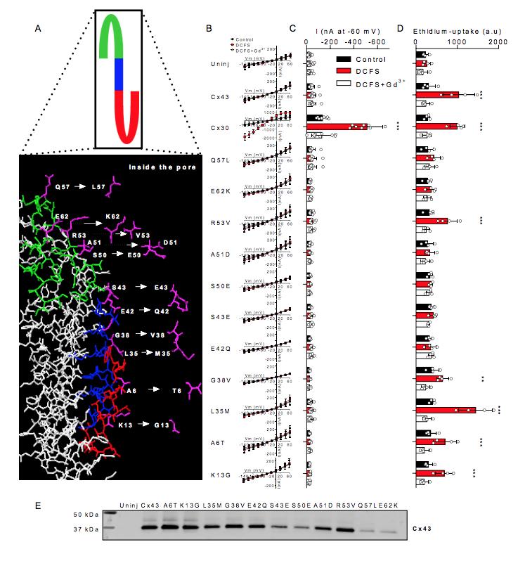 Fig. 2. Mutagenesis of select pore-lining residues does not alter Cx43 hemichannel ion conductance. A: Illustrates the predicted pore-lining region of a Cx43 monomer with the select predicted pore-lining residues that were mutated individually to the aligned amino acid in Cx30, marked in pink. B: I-V curves from uninjected-, Cx30-, Cx43-, and Cx43 mutant-expressing oocytes (n=17, n=9, n=11 and nâ¥7 for the mutations, respectively). C: Summarized membrane currents obtained at -60 mV. D: Ethidium uptake in uninjected-, Cx30-, Cx43-, and Cx43 mutant-expressing oocytes (all n=4). E: Western blot showing oocyte surface expression of Cx43 or the 11 Cx43 mutated constructs. Data in I/V curves and in the bar graphs are presented as mean ± SD. Statistical significance of DCFS-induced hemichannel activity within each group was tested using repeated measures two-way ANOVA (current, interaction: F(26,208) = 46.9, P<0.001; construct: F(13,104) = 68.3, P<0.001; test solution: F(2,208) = 55.0, P<0.001 and Eth, interaction: F(26,84) = 13.2, P<0.001; construct: F(13,42) = 4.2, P<0.001; test solution: F(2,84) = 184.7, P<0.001) with Dunnettâs post hoc test (against control). **; P < 0.01,***; P < 0.001. |