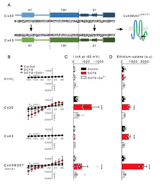 Fig. 4. Cx43 chimeras containing the N-terminus or the extracellular loop 1 of the Cx30 display DCFS activated membrane currents. A: Alignment of the NT-, TM1-, and E1 of Cx30 and Cx43 with the predicted pore-lining residues underlined in the amino acid sequence as well as an illustration of Cx43 chimeras containing the NT, TM1, or the E1 from Cx30. Western blot of oocyte surface expression of Cx43, Cx4330NT, Cx4330TM1, and Cx4330E1 in the right lower corner. B: Summarized I/V curves from uninjected-, Cx30-, Cx43-, Cx4330NT-, Cx4330TM1- and Cx4330E1-expressing oocytes (n=11, n=7, n=9, n=13, n=11 and n=15, respectively): Summarized membrane currents obtained at -60 mV. D: Ethidium uptake in uninjected-, Cx30-, Cx43-, Cx4330NT-, Cx4330TM1- and Cx4330E1-expressing oocytes (all n=5). Data in I/V curves and in the bar graphs are presented as mean ± SD. Statistical significance of DCFS induced hemichannel activity within each group was tested using repeated measures two-way ANOVA (current, interaction: F(10,120) = 137.5, P<0.001; construct: F(5,60) = 92.8, P<0.001; test solution: F(2,120) = 315.5, P<0.001 and Eth, interaction: F(10,48) = 20.3, P<0.001; construct: F(5,24) = 6.2, P<0.001; test solution: F(2,48) = 182.8 P<0.001) with Dunnettâs post hoc test (against control) and marked by asterisks above the bar. ***; P < 0.001. |