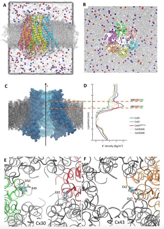 Fig. 6. Molecular dynamics of Cx30, Cx43 and Cx4330NT-E1 hemichannels. A-B: Side (A) and extracellular (B) view of the Cx30 model. The hemichannel is inserted in a phospholipid bilayer and simulations are performed in explicit solvent environment. Each of the six connexins composing the hemichannel are represented with different colors. K+ is blue and Clis red. In panel A, which represents a single snapshot of the simulation, it is possible to notice the accumulation of K+ in the extracellular part of the channel. C: Cx30 hemichannel embedded in the phospholipid bilayer. The proteins are represented according to their predicted solvent accessible surfaces. Two connexins are removed for showing the internal part of the channel. D: The graphs show the K+ density along the Z axis of the different hemichannels during the molecular dynamics simulations. The Z positions are centered on the midpoint of mass of each hemichannel, and the graphs are reported in register with the Cx30 hemichannel represented in panel C. The two orange dotted lines show the position of residues 42 and 49 in Cx30, which corresponds to 43 and 50 for Cx43 and Cx4330NT-E1. It is evident how K+ accumulates in the extracellular vestibule of Cx30 and Cx4330NT-E1, compared with Cx43. E-F: The position of acidic residues facing the pore in the E1 region for Cx30 (E) and Cx43 (F). For clarity, we report the position in one or two connexin polypeptides only. |
