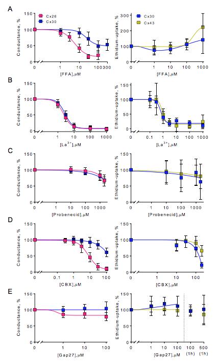 Fig. 7. Permeant-dependent isoform-specific inhibition. A-E (left panels): Cx26- and Cx30-mediated currents were obtained in DCFS with the indicated inhibitor concentrations (n=6-11). Membrane currents were recorded in DCFS from +60 to -140 mV in steps of 20 mV from a holding potential of -30 mV and the currents recorded at -120 mV were used for the inhibitor sensitivity curves upon normalization to the current obtained in the absence of inhibitor or peptide. A-E (right panels): Ethidium uptake was determined in Cx30- and Cx43-expressing oocytes after 40 minutes exposure to DCFS with drug concentrations indicated (n=3-6). For gap27 an additional exposure time of 1 hour (preincubated) were performed with 100 µM and 500 µM (n=3). Uninjected oocyte background uptake was subtracted, and the hemichannel-mediated ethidium uptake was normalized to the control uptake in the absence of inhibitor. Data are presented as mean ± SD. |