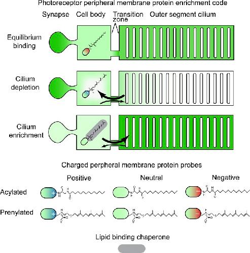 In neurons, peripheral membrane proteins are enriched in subcellular compartments, where they play key roles, including transducing and transmitting information. However, little is known about the mechanisms underlying their compartmentalization. To explore the roles of hydrophobic and electrostatic interactions, we engineered probes consisting of lipidation motifs attached to fluorescent proteins by variously charged linkers and expressed them in Xenopus rod photoreceptors. Quantitative live cell imaging showed dramatic differences in distributions and dynamics of the probes, including presynapse and ciliary OS enrichment, depending on lipid moiety and protein surface charge. Opposing extant models of ciliary enrichment, most probes were weakly membrane bound and diffused through the connecting cilium without lipid binding chaperone protein interactions. A diffusion-binding-transport model showed that ciliary enrichment of a rhodopsin kinase probe occurs via recycling as it perpetually leaks out of the ciliary OS. The model accounts for weak membrane binding of peripheral membrane proteins and a leaky connecting cilium diffusion barrier.