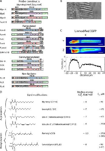 Figure 1. Expression and quantification of fluorescent probes in rods. (A) Amino acid sequences of PMP probes. (B) Transmission image of retinal slice preparation. (C) Confocal image in XY and XZ of a live rod expressing EGFP. Colors are a heat map: red is highest fluorescence, blue is lowest. Axial intensity values (lower panel) were taken along black lines. (B and C) Scale bars, 10 µm. (D) Structure, name, binding energy, and estimated membrane affinity of the lipid groups. The myristoylation motif results in heterogeneous acylation in retina, with four acyl varieties. In mammalians, the proportions are 55% C14:2, 20% C12:0, 16% C14:1, and 8% C14:0, as determined from mass spec of Tα (Kokame et al., 1992; Neubert et al., 1992; Johnson et al., 1994; Neubert and Hurley, 1998; Lobanova et al., 2007). Throughout, Myr refers to the myristoylation motif and acyl refers to lipids. Two Kds are given for prenyls, with that for carboxymethylated appearing in parentheses. Binding energies and membrane affinity estimates were based on in vitro partitioning experiments (Peitzsch and McLaughlin, 1993; Silvius and lâHeureux, 1994). |