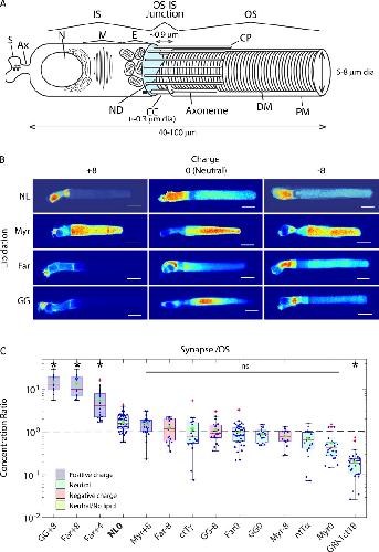 Figure 2. Lipidation and surface charge, alone, drive compartmentalization of PMPs. (A) Schematic of amphibian rod. S, Synaptic spherule; Ax, axon; N, nucleus; M, myoid; E, ellipsoid; ND, nascent discs; CC, connecting cilium; DM, mature disc membranes; and PM, plasma membrane. Cyan: Apical membrane. NDs are open to the extracellular milieu and contiguous with the CC and PM. DMs are enclosed within and separate from the OS PM and each other. (B) Confocal images of rod cells expressing PMP probes. Scale bars, 10 µm. (C) Box-whisker plots of average fluorescence in synapse divided by average fluorescence of OS. In all box-whisker plots, circles represent individual cells, red line is median, box limits are 25th and 75th percentiles, whiskers are interquartile range, excluding outliers (+), and green asterisks are means. Presence of differences among all probes was tested by one-way ANOVA, α = 0.05. Black asterisks indicate significant differences from NL0, determined by Tukey-corrected post hoc two-tailed t test. n for each construct: GG+8, 14; Far+8, 13; Far+4, 21; NL0, 29; Myr+8, 27; Far-8, 16; ctTγ, 17; GG-8, 22; Far0, 42; GG0, 20; Myr-8, 15; ntTα, 18; Myr0, 28; and GRK1ct18, 30. ns, not significant. |