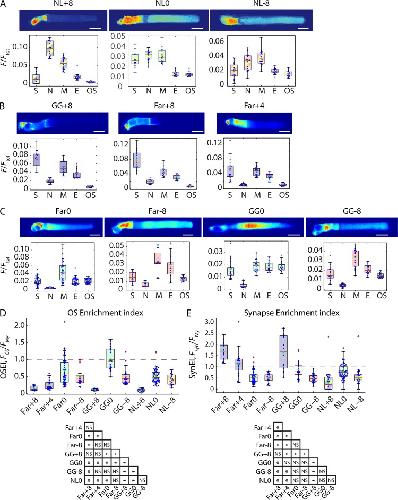 Figure 3. Distribution of prenylated probes dependds on linker charge. (A–C) Upper panels, representative confocal images. Scale bars, 10 µm. Lower panels, average compartment fluorescence normalized to total cell fluorescence. (D) OSEI, defined as the ratio of average OS fluorescence to average myoid fluorescence, FOS/FM. (E) SynEI, defined as ratio of average synaptic fluorescence to average myoid fluorescence, Fsyn/FM. (D and E) Lower panels are significance tables. *, P = 0.05; NS, not significant. Box fills as in Fig. 2 C key. Box-whisker plots as described in Fig. 2. n for each construct: NL+8, 14; NL0, 13; NL-8, 17; GG+8, 14; GG0, 20; GG-8, 22; Far+8, 13; Far+4, 21; Far0, 42; and Far-8, 16. |
