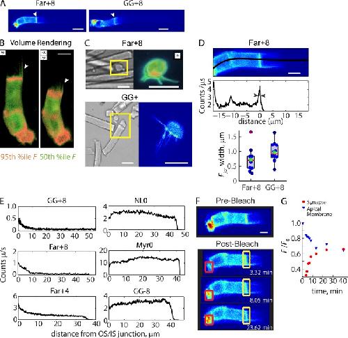 Figure 4. Positive prenylated probes are enriched in the cell body PM, perinuclear membranes, and the OSâIS junction. (A) Representative confocal images. Scale bars, 10 µm. Arrowheads: OSâIS junction. (B) 3D renderings of the Far+8 rod shown in A, at different angles (see angle indicators). Green: 50th percentile, red: 90th percentile intensities. White arrowheads: CPs (Videos 1, 2, and 3). Scale bar, 5 µm. (C) Confocal images of broken OSâIS showing fluorescence-containing CPs separated from OS. Scale bars, 5 µm. (D) OSâIS junction enrichment width estimate. Upper panel: Confocal image of Far+8 rod in A with OSâIS junction expanded. Scale bar, 5 µm. Middle panel: Fluorescence intensities as a function of axial distance; zero is the OSâIS junction. Arrowheads show half maximum fluorescence. Bottom panel, Junction widths for Far+8 and GG+8 cells were not different as determined by two-tailed T test assuming equal variance. Box-whisker plot as described in Fig. 2. n for each construct: Far+8, 9; and GG+8, 12. (E) Fluorescence as a function of distance within the OS. Left panels: Representative profiles from positive prenylated probes. Right panels: OS distributions of other PMPs. (F) FRAP of Far+8 in the synapse. Red box: Spherule region of interest (ROI); yellow box: OSâIS junction ROI. Scale bar, 5 µm. (G) Time course of synapse fluorescence recovery and OSâIS junction fluorescence loss. |