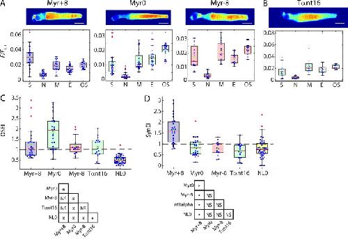 Figure 6. Myristoylated probes are enriched in the OS regardless of linker charge. (A) Upper panels: Representative confocal images of rods expressing Myr probes. Lower panels: Compartment distribution profiles. (B) Confocal image and compartment distribution profile of Tαnt16. (A and B) Scale bars, 10 µm. (C) OSEIs of myristoylated probes. Box-whisker plots as described in Fig. 2. Significance table shows that all probes had significantly higher OSEIs than NL0. (D) SynEIs show that Myr+8 is the only presynapse enriched probe. Significance tables: P ≤ 0.05; NS, not significant. n for each construct: Myr+8, 27; Myr0, 28; Myr-8, 15; and Tαnt16, 18. |