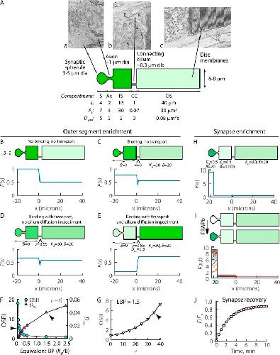 Figure 9. Contributions of local binding, active transport, and cilium diffusion impediment to OS and synaptic enrichment of PMPs, computed by the DBT model. (A) Schematic of model rod with compartments labeled as in Fig. 2 A. Representative electron micrographs show the geometries of the compartments. Note the many synaptic vesicles filling the spherule (a) and the density and order of OS disc membranes (c). Parameters for each compartment used in all computations are listed: L, length; Ac, area of cross-section; and DGFP, diffusion coefficient of unmodified EGFP. EM images reproduced with permission from a (Schacher et al., 1976), b (Peters et al., 1983), and c (Townes-Anderson et al., 1985). a and b, Scale bars, 1 µm. c, Magnification = 45,000. dia, diameter. (BâE) DBT predictions of EGFP-GRK1ct18 distribution show that active transport and the connecting cilium diffusion impediment, together, are the major contributors to OS enrichment; local OS binding played a minor role. (F) Predictions of OSEI, F(OS)/F(IS) from model traces, and effective DOS, found by fitting model FRAPs as described in Fig 7, plotted versus equivalent binding power. Arrowhead on the DOS line shows that at EBP = 1.5, DOS was approximately twofold lower than that for no binding, as found experimentally for EGFP-GRK1ct18 and EGFP-Far0 versus EGFP (Fig. 7). However, the OSEI was <1. The OSEI line shows that tighter OS binding can lead to fivefold (arrowhead) or better OS enrichment, but at the cost of mobility. BP, binding power. (G) Transport velocity versus predicted OSEI, given OS EBP = 1.5. Arrowhead indicates the velocity that produces the observed approximately fivefold OS enrichment, as found experimentally for EGFP-GRK1ct18. (HâJ) Higher synapse affinity resulted in significant enrichment (H) and FRAP recovery t1/2 â¼2 min (I and J), similar to experimental results for Far0 (Fig. 4 G), suggesting the distribution of Far0 within the IS is mediated by equilibrium binding alone. |