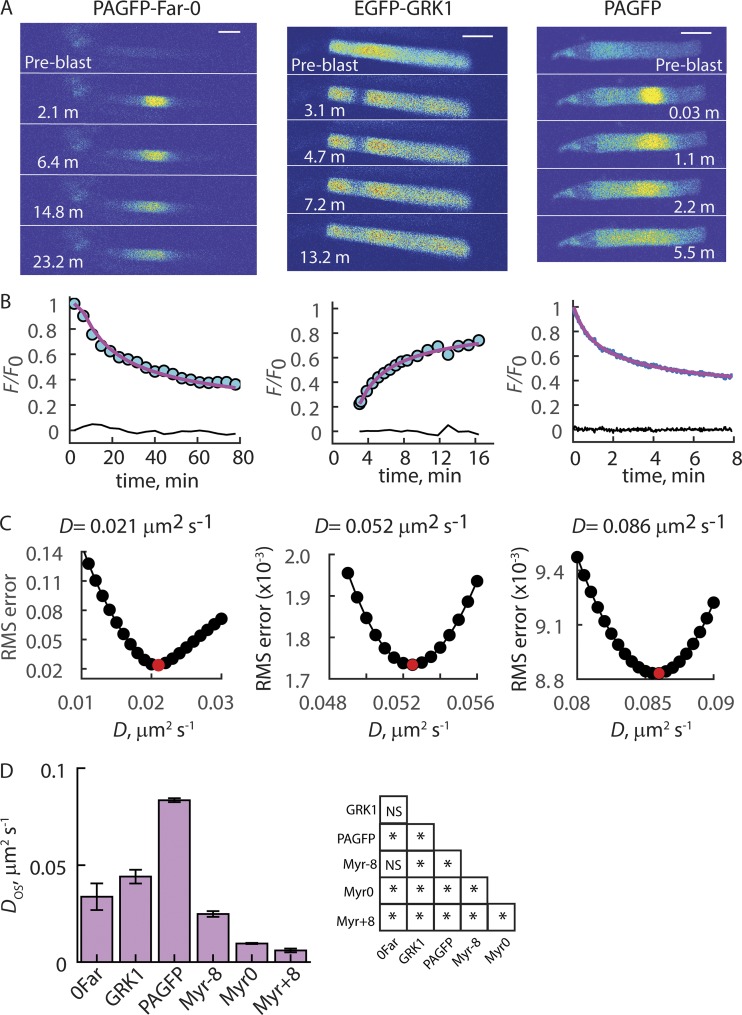 Figure 7. OS mobility shows low affinity binding of prenylated probes to disc membranes and that binding affinity of myristoylated probes scales with charge. (A) Representative time course images of FRAPa or FRAPb experiments. Pre-blast images: Distributions before two-photon photoactivation or photobleaching. Scale bars, 10 µm. (B) Time courses of fluorescence relaxation at the center of the photoconversion sites fitted with a 3D cylindrical diffusion model, magenta lines. Black lines: Data-model difference. (C) Root-mean-square (RMS) errors plotted against D. red circle indicates D with lowest error, and value shown above plots. (D) Bar chart of average DOSs. Error bars are SEM. ANOVA followed by two-tailed, homoscedastic t test with Tukey correction showed that DOSs for all lipidated probes were significantly different from the DOS for PAGFP. DOSs among 0Far and GRK1 were not different. Significance tables: P ⤠0.05; NS, not significant. n for each construct: 0Far, 6; GRK1, 5; PAGFP, 6; Myr-8, 8; Myr0, 3; and Myr+8, 3. |