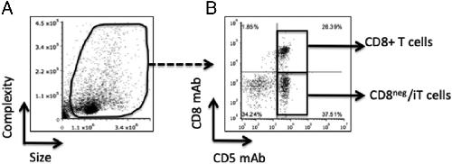 Figure 2. Flow cytometric analysis of T cell in spleen and liver of adults and tadpoles. Four-month-old young adults and 3-wk-old tadpoles were i.p. inoculated with 1 Ã 106 or 3 Ã 105 CFU of M. marinum, respectively (n = 5â6 per time point). Then, the total lymphocytes at different dpi were stained with Xenopus-specific CD5 mAb and CD8 mAb to analyze two subsets of T cell populations (A and B). After gating on live cells, CD8+CD5+ cells and CD8negCD5+ cells were defined (black boxes).