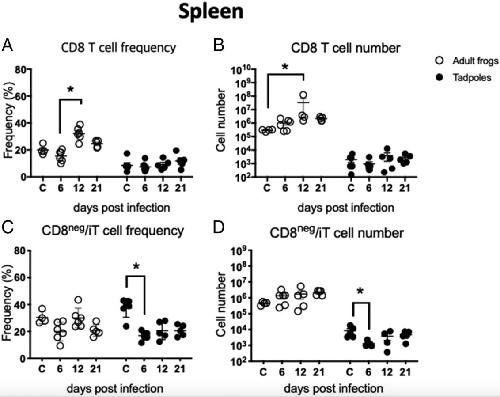 Figure 3. Comparison of the frequency and the number of CD8 and CD8neg T/iT cells in the spleen of adults and tadpoles following M. marinum inoculation. Using the flow cytometric strategy shown in Fig. 2, the kinetics of CD8 T cell (A) frequency and (B) number were determined in adults (white) and tadpoles (black) at different days postinoculation (n = 6â7 per group from two independent experiments). Furthermore, the kinetics of CD8neg T/iT cell (C) frequency and (D) number were determined. Asterisks indicated statistical significance by the KruskalâWallis test, nonparametric. C, uninfected control.