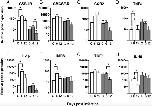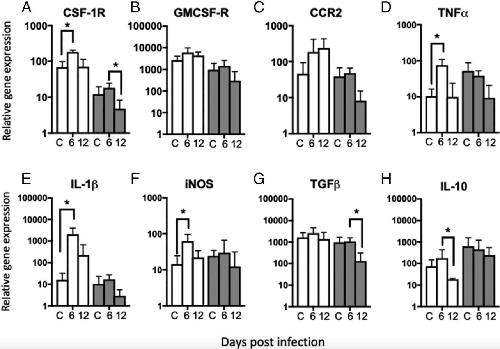 Figure 8. Relative expression of immune receptor genes and pro- and anti-inflammatory cytokine genes in the liver of M. marinumâinoculated adults and tadpoles. Four-month-old young adults (white bar) and 3-wk-old tadpoles (gray bar) were i.p. inoculated with 1 à 106 or 3 à 105 CFU of M. marinum, respectively (n = 5â6 per time point). The relative gene expression in the liver was determined for the immune gene receptors (A) CSF-1R (macrophage recruitment marker), (B) G-CSF-R (neutrophil recruitment marker), and (C) CCR2 (inflammatory monocyte marker); for the proinflammatory cytokine genes (D) TNF-α, (E) IL-1β, and (F) iNOS; and for the anti-inflammatory cytokine genes (G) TGF-β and (H) IL-10. All the data were normalized to the housekeeping gene gapdh. Asterisks indicate significant difference by the KruskalâWallis test (p < 0.05). C, uninfected control.