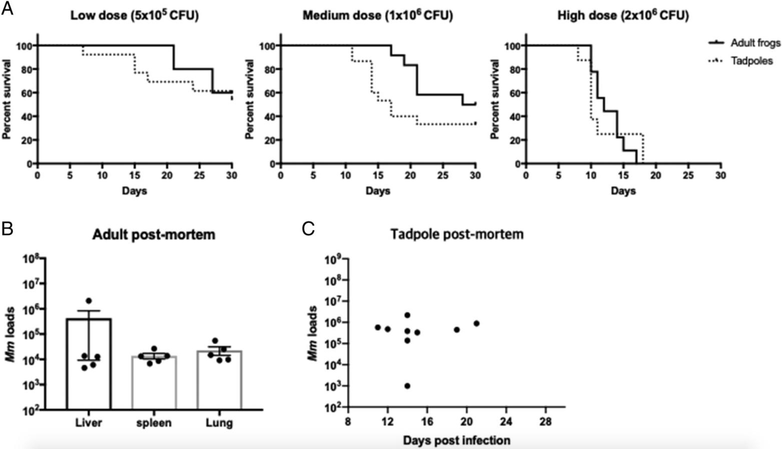 Figure 1. Survival curves of M. marinum–inoculated adults and tadpoles of X. laevis. (A) Four-month-old adults (n = 5–10 per group) and 3-wk-old tadpoles (developmental stage of 52, n = 10–19 per group) were inoculated with different amounts of M. marinum i.p. (5 × 105 CFU for low dose, 1 × 106 CFU for medium dose, and 2 × 106 CFU for high dose). The survival rate was dependent on the doses of M. marinum based on the Cox proportional hazard model analysis (p < 0.05). Comparisons of survival rates between adult frogs and tadpoles for each dose, as well as median survival times, are listed in Table II. (B) M. marinum loads in different organs from postmortem adults. (C) M. marinum loads of whole individual postmortem tadpoles. Viral loads were determined by real-time PCR using M. marinum–specific 16S rRNA gene.