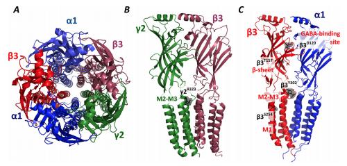 Figure 1. A, pentameric structure of the GABA and diazepam-bound 132 receptor (PDB code 6HUP) from above showing the orientation of the subunits.