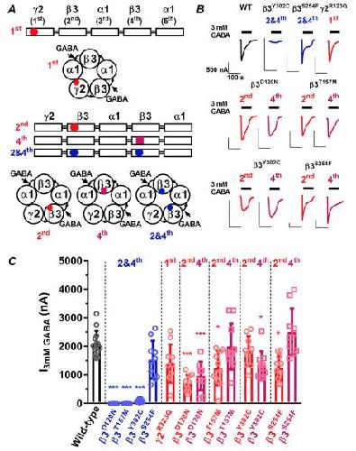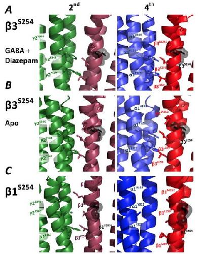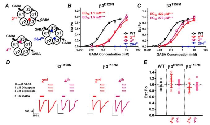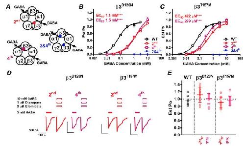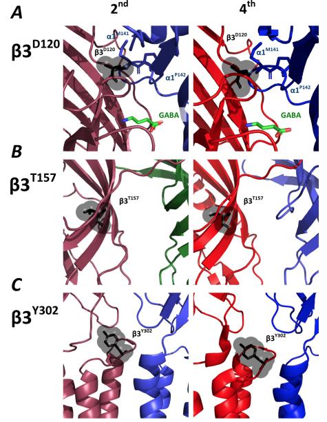 3D120N residue at the GABA-binding site, the 3T157M residue within an internal -sheet, the 3Y302C residue in the M2-M3 loop, and the 3S254F residue in the