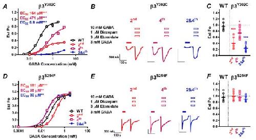Figure 6. A, concentration–response curve to GABA of WT 2-3-1-3-1 (open black circles), 2-3Y302C-1-3-1 (open red circles), 2-3-1-3Y302C-1 (open purple squares) and 2-3Y302C-1-3Y302C-1 (closed blue circles) receptors normalized to the Est. Po(max) and fitted to the Hill equation.Dots, mean S.E. (error bars) of 10 –13 individual experiments. The EC50 of the mutant receptor derived from the curve fit is shown. *, p 0.05; **, p 0.01; ***, p 0.001