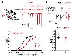 representative data (right) from a single two-electrode voltage clamp experiment where different concentrations of GABA (open bars) were applied to construct a concentration–response curve to GABA at 2R323Q-3-1-3-1 receptors. Filled dark red bars and traces represent reference 3 mM GABA applications, and open red bars and traces represent GABA applications at the concentrations shown. Shown is a concentration–response curve to GABA (below) of WT2-3-1-3-1 (E) and 2R323Q-3-1-3-1 (E) receptors normalized to the Est. Po(max) and fitted to the Hill equation.Dots, mean S.E. (error bars) of 10 –13