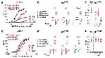 Figure 5. A, schematic of concatenated receptor indicating the location of 3D120N and 3T157M mutations introduced within the second (closed red circle), fourth (closed purple square) or the second and fourth(closed blue circles) subunits within the resulting pentameric receptor. B, concentration–response curve to GABA of WT2-3-1-3-1 (open black circle), 2-3D120N-1-3-1 (open red circle), 2-3-1-3D120N-1 (open purple square), and 2-3D120N-1-3D120N-1 (closed blue circle) receptors; C, Concentration–response curve to GABA of WT 2-3-1-3-1 (open black circle), 2-3T157M-1-3-1 (open red circle), 2-3-1 3T157M-1 (open purple square), and 2-3T157M-1-3T157M-1 (closed blue circle) receptors normalized to the Est. Po(max) and fitted to the Hill equation. The EC50 of the mutant receptor derived from the curve fit is shown. *, p 0.05; **, p 0.01; ***, p 0.001 compared with WT, one-way ANOVA with Tukey’s post hoc test.D, representative traces of3D120N and3T157M receptors after application of 3mM GABA(filled bars) and 10mM GABA, 1M diazepam, and 3M etomidate(open bars), respectively.Red traces indicate mutation at the second subunit location, and purple traces indicate mutation at the fourth. Scale bars, 500 nA and 100 s. E, estimatedGABAPo(max)ofWT, 3D120N, and 3T157M receptors was determined by dividing the current elicited by 3 mM GABA by the current elicited by 10 mM GABA, 1 M diazepam, and 3 M etomidate and corrected for the reference 3 mM GABA. Open gray circles, WT; open red circles, receptors with a mutation in the second position; open purple squares, receptors with a mutation in the fourth position. Lines and error bars represent mean S.D. of 10 individual cells. |