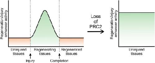 Fig. 3. Silenced regeneration/injury enhancer in uninjured tissues. After peripheral nerve injury, injury-induced enhancers emerge in Schwann cells. However, the loss of PRC2 activity results in aberrant activation of injury-induced enhancers in uninjured cells, leading to upregulation of myelin-regulated genes and subsequent hypermyelination and morphological change.