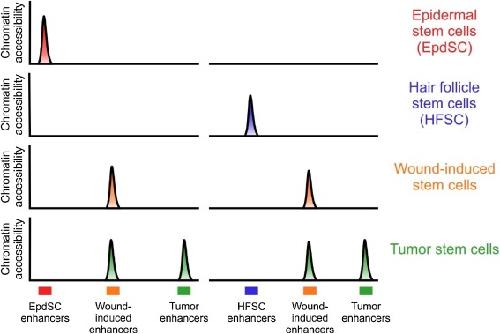 Fig. 4. Tumor hijacks regeneration/injury enhancers for infinite division. Each track represents ATAC-seq peaks of epidermal stem cells (EpdSCs), hair follicle stem cells (HFSCs), wound-induced stem cells, and tumor stem cells of mouse skin. Under the homeostatic condition, epidermal stem cells (EpdSCs) and hair follicle stem cells (HFSCs) have their own open chromatin signatures. Upon wound injury, lineage-specific open chromatin signatures collapse and wound-specific signatures emerge. Wounded-induced and tumor stem cells exhibit similar global open chromatin profiles, but tumor stem cells display additional tumor-specific ATAC-seq peaks, indicating that misregulation of wound-induced regulatory events can lead to tumor.