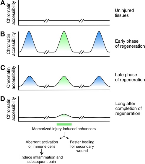 Fig. 5. Epigenetically memorized injury-induced enhancers. Each track represents ATAC-seq peaks of uninjured tissues (A), early (B) and late phase (C) of regenerating tissues, and completely regenerated tissues (D). A subset of injury-induced enhancers is not completely resolved long after completion of regeneration. These epigenetically memorized enhancers may mediate aberrant activation of immune cells in the central nervous system (CNS), resulting in chronic neuropathic pain. In mouse skin, the memorized enhancers contribute to faster healing of secondary wound.