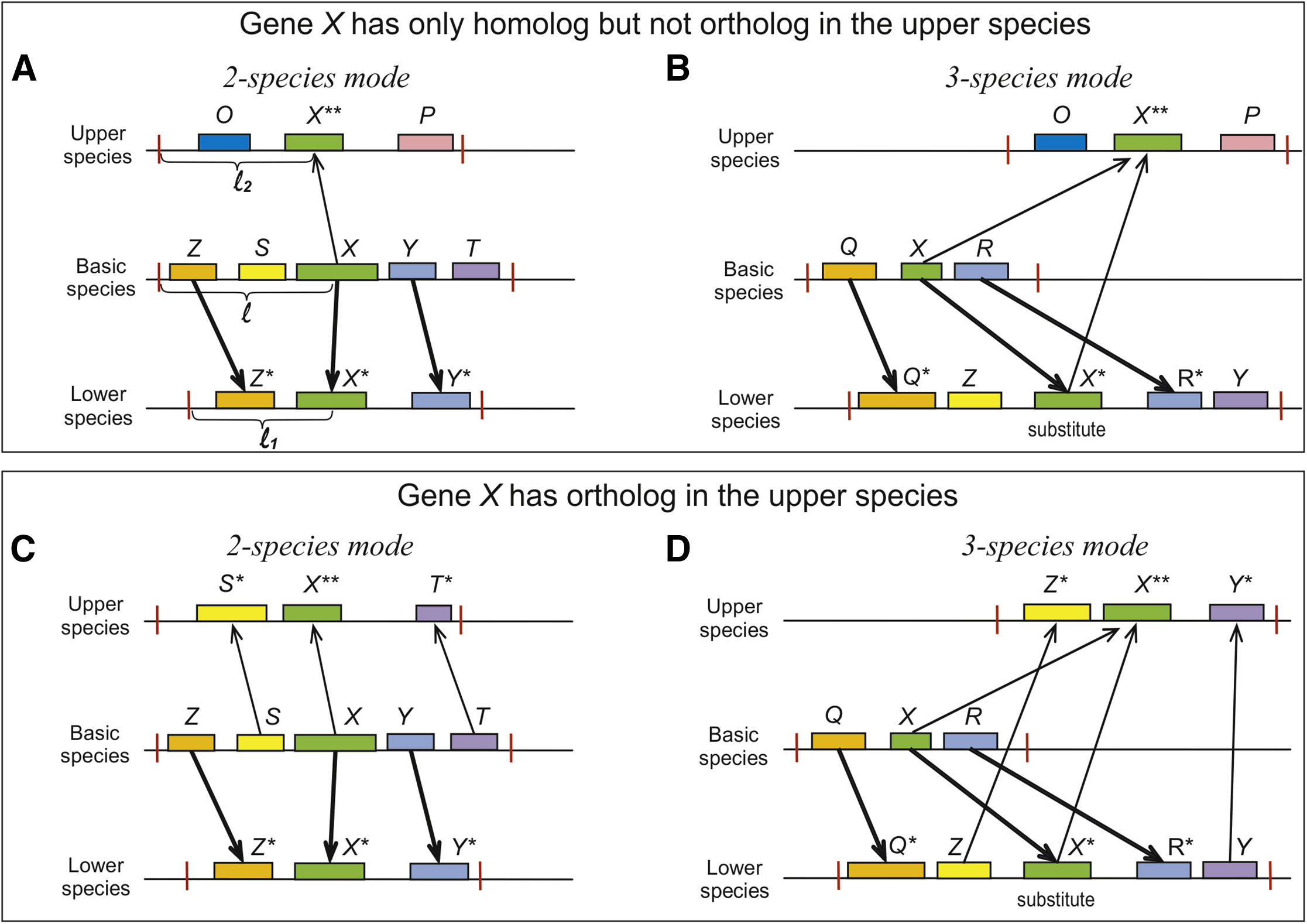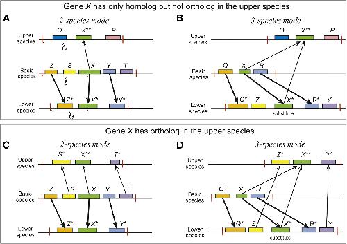 Figure 1. The 2- and 3-Species Selection Modes for Genes with No Orthologs in the Upper Species (A and B) The schemes demonstrate the case when gene X is considered to be the lost gene for the 2- and 3-species modes. Gene X only has homolog Xââ but no ortholog in the upper species because the neighbors of X in the basic (for 2-species mode, A) or lower (for 3-species mode, B) species (Z, S, Y or Qâ, Râ, Y, respectively) have no homologs in the upper species, where the neighbors of gene Xââ are O and P. The red ticks indicate the borders of the âwindowâ in which local synteny has been checked. The size of the window, l, was chosen in this particular work to be 2 Mbp for all genes: l = l1 = l2. Thin and bold arrows indicate homologous and orthologous genes in the upper and lower species, respectively. (С and D) The schemes demonstrate the case in which gene X is considered to be preserved for the 2- and 3-species modes, respectively. Gene X has an ortholog Xââ in the upper species because at least one of the neighbors of X in the basic (for 2-species mode, C) or lower (for 3-species mode, D) species (Z, S, Y or Qâ, Râ, Y, respectively) has a homolog in the upper species, where the neighbors of gene Xââ are Yâ and Sâ. |