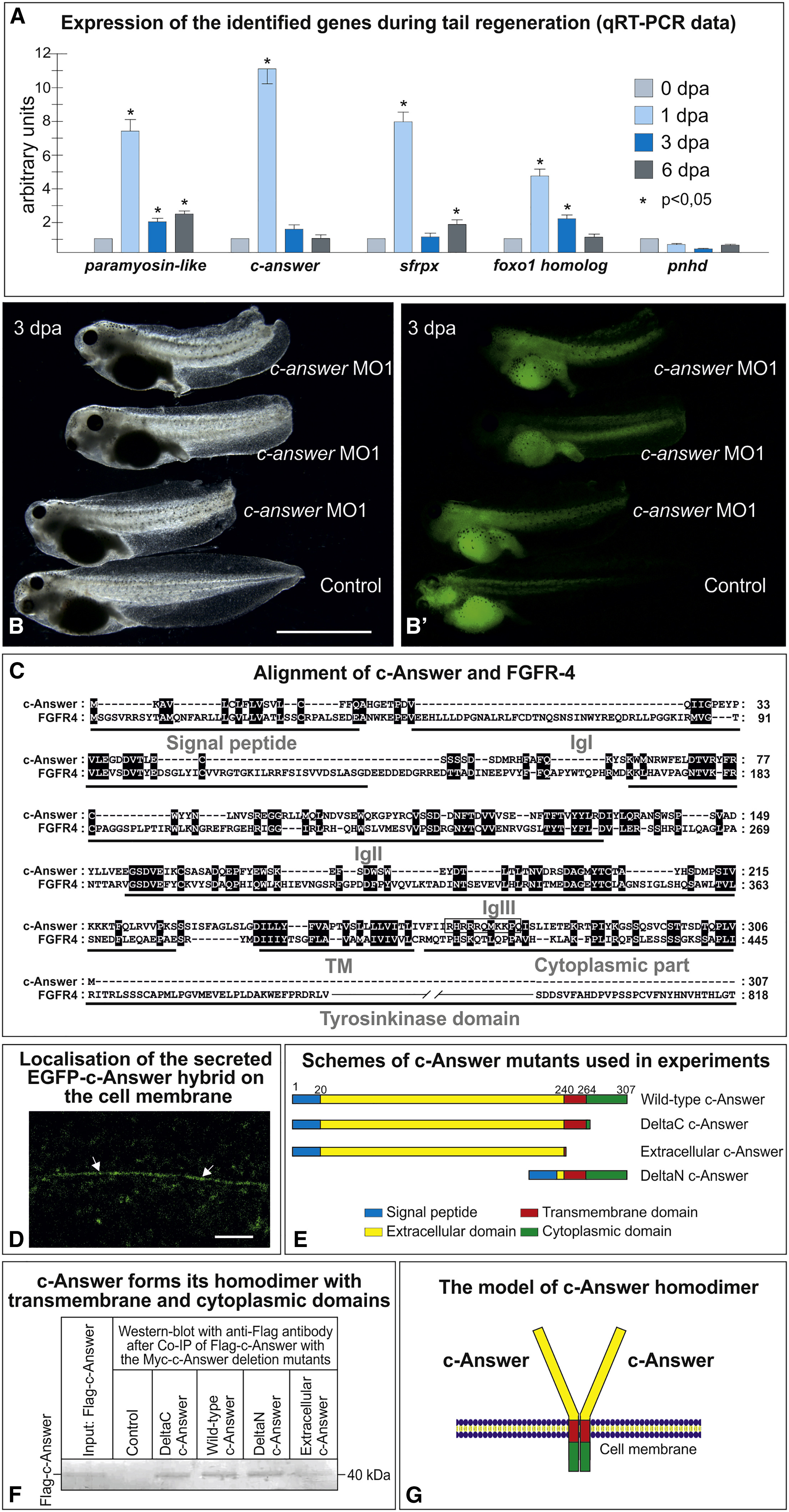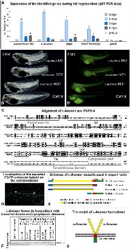 Figure 2. Investigation of the Expression and Function of Genes Identified As a Result of Bioinformatic Screening during X. laevis Tadpole Tail Regeneration and Analysis of the Structure of c-Answer Protein (A) qRT-PCR analysis of c-answer expression in the blastema during tail regeneration at the indicated day post-amputation. All of the results were normalized to the geometric mean expression of two housekeeping genes (ef1alfa and odc) as previously described (Ivanova et al., 2013). (B) Injection of anti-sense morpholino oligonucleotides to c-answer mRNA inhibits tadpole tail regeneration. (Bâ) Fluorescent image of the same embryos shown in (B) demonstrating the distribution of the co-injected tracer fluorescein lysine dextran (FLD). (C) Alignment of c-Answer with FGFR4. (D) Localization of the secreted hybrid of EGFP and c-Answer on the membrane of the animal cap cell as revealed by confocal microscopy. (E) Schematics of the c-Answer deletion mutants used in the co-immunoprecipitation and functional analysis experiments. (F) Western blotting with a FLAG-antibody after coIP of FLAG-c-Answer with different Myc-tagged c-Answer deletion mutants, as shown in (C). (G) The c-Answer homodimer model according to the coIP results shown in (D). Scale bars: 1 mm in (B) and 200 nm in (D). See also Figures S1 and S2. |