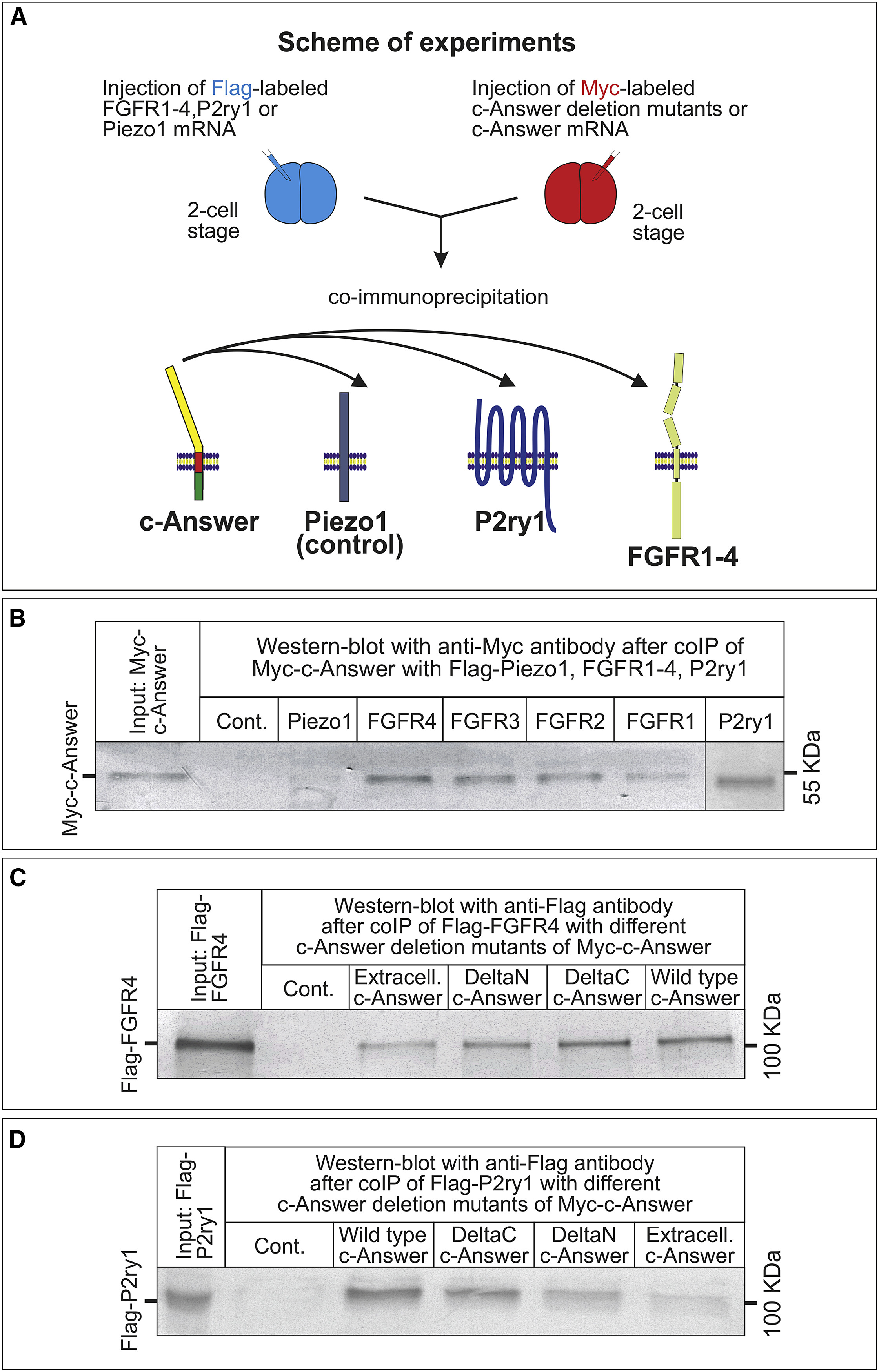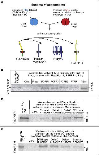 Figure 6. Analysis of the Binding Capacity of c-Answer and Its Deletion Mutants to the FGFR1â4 and P2ry1 Receptors (A) Schematic of the experiments. FLAG- and Myc-tagged proteins were separately expressed from synthetic mRNAs in the embryos, and the embryonic extracts were mixed for coIP and analyzed by western blotting. (BâD) Western blotting analysis with anti-Myc or anti-FLAG antibodies after coIP of Myc-c-Answer with FLAG-Piezo1, FGFR1â4, P2Y1 (B), of FLAG-FGFR4 with different c-Answer deletion mutants of Myc-c-Answer (C), or FLAG-P2ry1 with different deletion mutants of Myc-c-Answer (D). Cont. means the control western blotting with indicated antibody (Myc or FLAG) after application on anti-Myc or anti-FLAG resin of only Myc-c-Answer, FLAG-FGFR4, or FLAG-P2Y1, without preliminary coIP. |