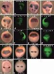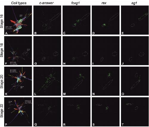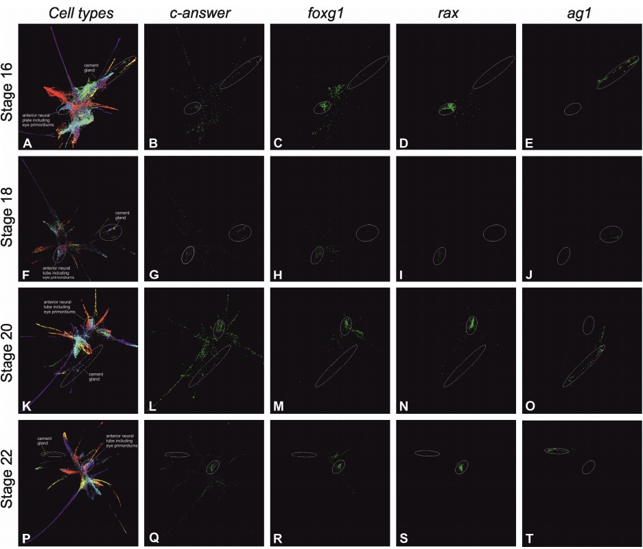 Figure S3. Distribution of c-answer, the forebrain primordium markers foxg1 and rax and the cement gland marker ag1 expression according to single cell sequencing data in embryos at stages 16, 18, 20 and 22 (Briggs et al., 2018), Related to Figure 3. A. Stage 16, all embryonic cells arranged by their expression profile similarity (Briggs et al., 2018), clustered and colored according to the tissue subtype, where they belong. The area corresponding to cells of anterior neural plate including eye primordia is circled by white line. For legend see https://kleintools.hms.harvard.edu/tools/springViewer_1_6_dev.html?cgibin/client_datasets/xenopus_embryo_timecourse_v2/S16 B. Stage 16, cells expressing c-answer are colored green. The intensity of green color depends on the number of c-answer mRNA present in cell, more intense color relates to greater amount of c-answer mRNA molecules per cell. The area corresponding to cells of anterior neural plate including eye primordia is circled by white line. C. Stage 16, cells expressing marker of the telencephalic and dorsal eye primordia, foxg1, are colored green. The area corresponding to cells of anterior neural plate including eye primordia is circled by white line. D. Stage 16, cells expressing marker of the eye and forebrain primordia, rax, are colored green. The area corresponding to cells of anterior neural plate including eye primordia is circled by white line. E. Stage 18, all embryonic cells are clustered and colored according to the tissue subtype, where they belong. The area corresponding to cells of anterior neural tube including eye primordia is circled by white line. For legend see https://kleintools.hms.harvard.edu/tools/springViewer_1_6_dev.html?cgibin/client_datasets/xenopus_embryo_timecourse_v2/S18 F. Stage 18, cells expressing c-answer are colored green. The area corresponding to cells of anterior neural plate including eye primordia is circled by white line. G. Stage 18, cells expressing marker of the eye and forebrain primordia, foxg1, are colored green. The area corresponding to cells of anterior neural tube including eye primordia is circled by white line. H. Stage 18, cells expressing marker of the eye and forebrain primordia, rax, are colored green. The area corresponding to cells of anterior neural tube including eye primordia is circled by white line. I. Stage 20, all embryonic cells are clustered and colored according to the tissue subtype, where they belong. . The area corresponding to cells of anterior neural tube including eye primordia is circled by white line. For legend see https://kleintools.hms.harvard.edu/tools/springViewer_1_6_dev.html?cgibin/client_datasets/xenopus_embryo_timecourse_v2/S20 J. Stage 20, cells expressing c-answer are colored green. The area corresponding to cells of anterior neural tube including eye primordia is circled by white line. K. Stage 20, cells expressing marker of the eye and forebrain primordia, foxg1, are colored green. The area corresponding to cells of anterior neural tube including eye primordia is circled by white line. L. Stage 20, cells expressing marker of the eye and forebrain primordia, rax, are colored green. The area corresponding to cells of anterior neural tube including eye primordia is circled by white line. M. Stage 22, all embryonic cells are clustered and colored according to the tissue subtype, where they belong. For legend see https://kleintools.hms.harvard.edu/tools/springViewer_1_6_dev.html?cgibin/client_datasets/xenopus_embryo_timecourse_v2/S22 N. Stage 22, cells expressing c-answer are colored green. The area corresponding to cells of anterior neural plate including eye primordia is circled by white line. O. Stage 22, cells expressing marker of the eye and forebrain primordia, foxg1, are colored green. The area corresponding to cells of anterior neural tube including eye primordia is circled by white line. P. Stage 22, cells expressing marker of the eye and forebrain primordia, rax, are colored green. The area corresponding to cells of anterior neural tube including eye primordia is circled by white line. |
