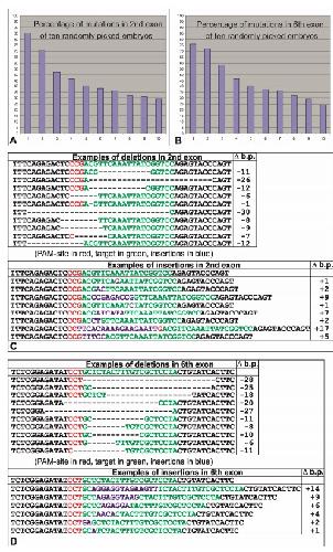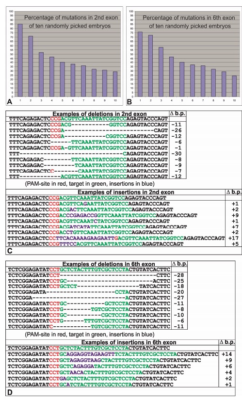 Figure S4. The results of embryo genotyping after c-answer CRISPR/Cas9 knockout on two target sites, Related to Figure 4. A. Diagram showing percentage of mutations after CRISPR/Cas9 procedure in ten randomly picked embryos at late gastrula stage injected with sgRNA for target site in 2nd c-answer exon of c-answer and Cas9 protein (see Figure S4 for the target site location). B. Diagram showing percentage of mutations after CRISPR/Cas9 procedure in ten randomly picked embryos at late gastrula stage injected with sgRNA for target site in 6th c-answer exon and Cas9 protein (see Figure S4 for the target site location). C. Examples of deletions and insertions in 2nd c-answer exon after CRISPR/Cas9 procedure. D. Examples of deletions and insertions in 6th c-answer exon after CRISPR/Cas9 procedure. |