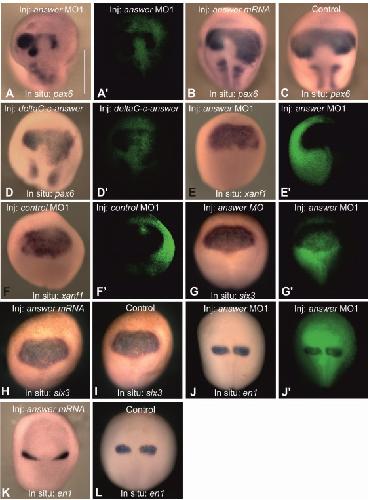 Figure S6. Whole-mount in situ hybridization with probes to the transcripts of the indicated genes of embryos injected with c-answer MO1 or c-answer mRNA variants, Related to Figure 5. A. Inhibition of the pax6 expression on the right side of the middle neurula embryos injected with c-answer MO1 into the right dorsal blastomere at 4-cell stage. Left side is not injected control. A'. The fluorescent image for A demonstrating the distribution of green fluorescent tracer, FLD, co-injected with c-answer MO1. B. Ectopic pax6 expression in the middle neurula embryos injected with c-answer MO1 into 2 blastomeres at 2-cell stage. C. pax6 expression in the control (not injected) middle neurula embryos. D. Ectopic pax6 expression on the right side of the middle neurula embryos injected with deltaCc-answer mRNA into the right dorsal blastomere at 4-cell stage. Left side is not injected control. D'. The fluorescent image for D demonstrating the distribution of green fluorescent tracer, FLD, co-injected with deltaC-c-answer mRNA. E. No effect on xanf1 expression in the middle neurula embryos injected with c-answer MO1 into the left dorsal blastomere at 4-cell stage. E'. The fluorescent image for E demonstrating the distribution of green fluorescent tracer, FLD, co-injected with c-answer MO1. F. No effect on xanf1 expression in the middle neurula embryos injected with the control canswer misMO into the left dorsal blastomere at 4-cell stage. F'. The fluorescent image for F demonstrating the distribution of green fluorescent tracer, FLD, co-injected with c-answer misMO. G. No effect on six3 expression in the middle neurula embryos injected with c-answer MO1 into the right dorsal blastomere at 4-cell stage. G'. The fluorescent image for G demonstrating the distribution of green fluorescent tracer, FLD, co-injected with c-answer MO1. H. No effect on six3 expression in the middle neurula embryos injected with c-answer mRNA into 2 blastomeres at 2-cell stage. I. six3 expression in the control (not injected) middle neurula embryo. J. No effect on en1 expression in the middle neurula embryos injected with c-answer MO1 into 2 blastomeres at 2-cell stage. J can be referred to as not injected control. J'. The fluorescent image for H demonstrating the distribution of green fluorescent tracer, FLD, co-injected with c-answer MO1. K. Inhibition of the en1 expression in the middle neurula embryos injected with c-answer mRNA into 2 blastomeres at 2-cell stage. L. En1 expression in the control (not injected) middle neurula embryo. Scale bars 500 µm for all photos is shown on A. |