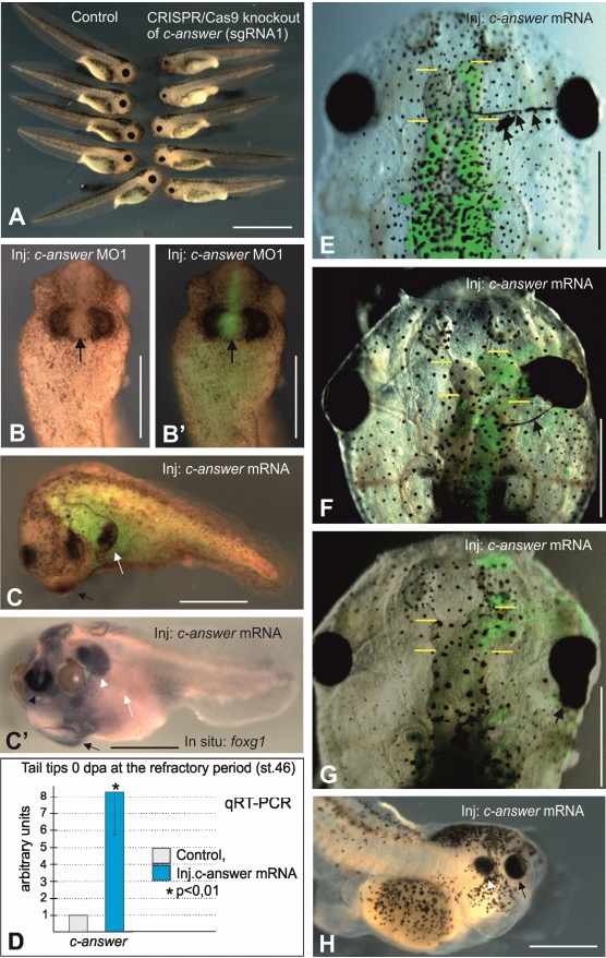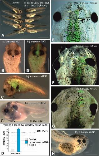 Figure S7. Phenotypes of tadpoles after c-answer knockout and overexpression of c-answer variants, Related to Figure 4 and Figure 5. A. Tadpoles with c-answer knockout in 2nd exon (right) have smaller eyes than the control ones (left). B and B'. Local injection of c-Answer MO mixed with FLD tracer in one blastomere, which give rise to the middle part of the cement gland, at 16-cell stage resulted in the inhibition of the cement gland differentiation in this part. The embryo at stage 26 is shown from the ventral side, anterior to the top. С. Tadpole overexpressing wild-type c-Answer has ectopic cement gland on the head process (Zerbino et al.). С'. Whole-mount in situ hybridization with the probe to foxg1 of the same tadpole as on C reveals additional telencephalon within the head process (arrow head). D. QRT-PCR analysis of c-answer mRNA in the tail tips of stage 46 tadpoles developed from the wild-type embryos and from embryos injected with this mRNA. E-G. Ectopic RPE differentiation and enlarged telencephalon on the injected side in tadpoles overexpressing wild-type c-Answer (arrows). Yellow bars indicate the telencephalon anterior and posterior borders. H. Ectopic eye in tadpole overexpressing wild-type c-Answer. Scale bars: A 250 µm; B-C', E-H 500 µm. |