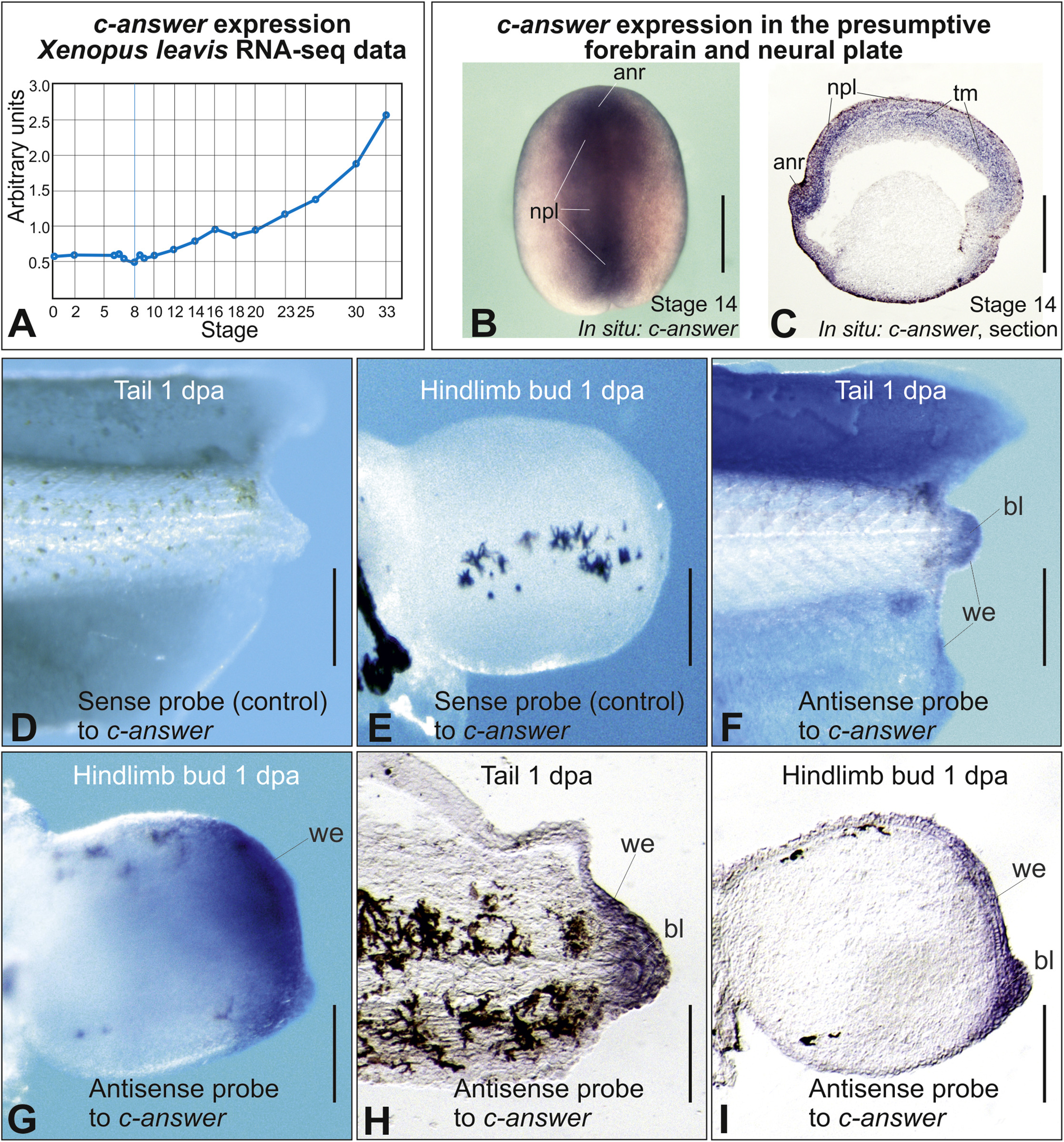 Figure 3. Analysis of c-answer Expression during the Early Embryonic Development and in the Processes of Tail and Hindlimb Bud Regeneration of X. laevis (A) Temporal expression of c-Answer as revealed by RNA sequencing (RNA-seq) analysis (Yanai et al., 2011). (B and C) In situ hybridization with a c-Answer probe in the whole-mounted middle neurula (B) and the frozen sagittal section of the embryo at the middle neurula stage (C). Anr, anterior neural ridge; npl, neural plate; tm, trunk mesoderm. (D and E) Whole-mount in situ hybridization with a sense probe to c-answer (control) of the amputated tail (D) and hindlimb bud (E) at day 1 post-amputation. (F and G) Whole-mount in situ hybridization with an anti-sense probe to c-answer of the amputated tail (F) and hindlimb bud (G) on day 1 post-amputation. Increased c-Answer expression is observed in the wound epithelium (we) and blastema (bl). (H and I) Frozen histological sections of the regenerating tail (H) and hindlimb bud (I) hybridized whole-mount with an anti-sense probe to c-answer. Scale bars: 500 μm in (B) and (C) and 50 μm in (D)â(I). See also Figure S3. |