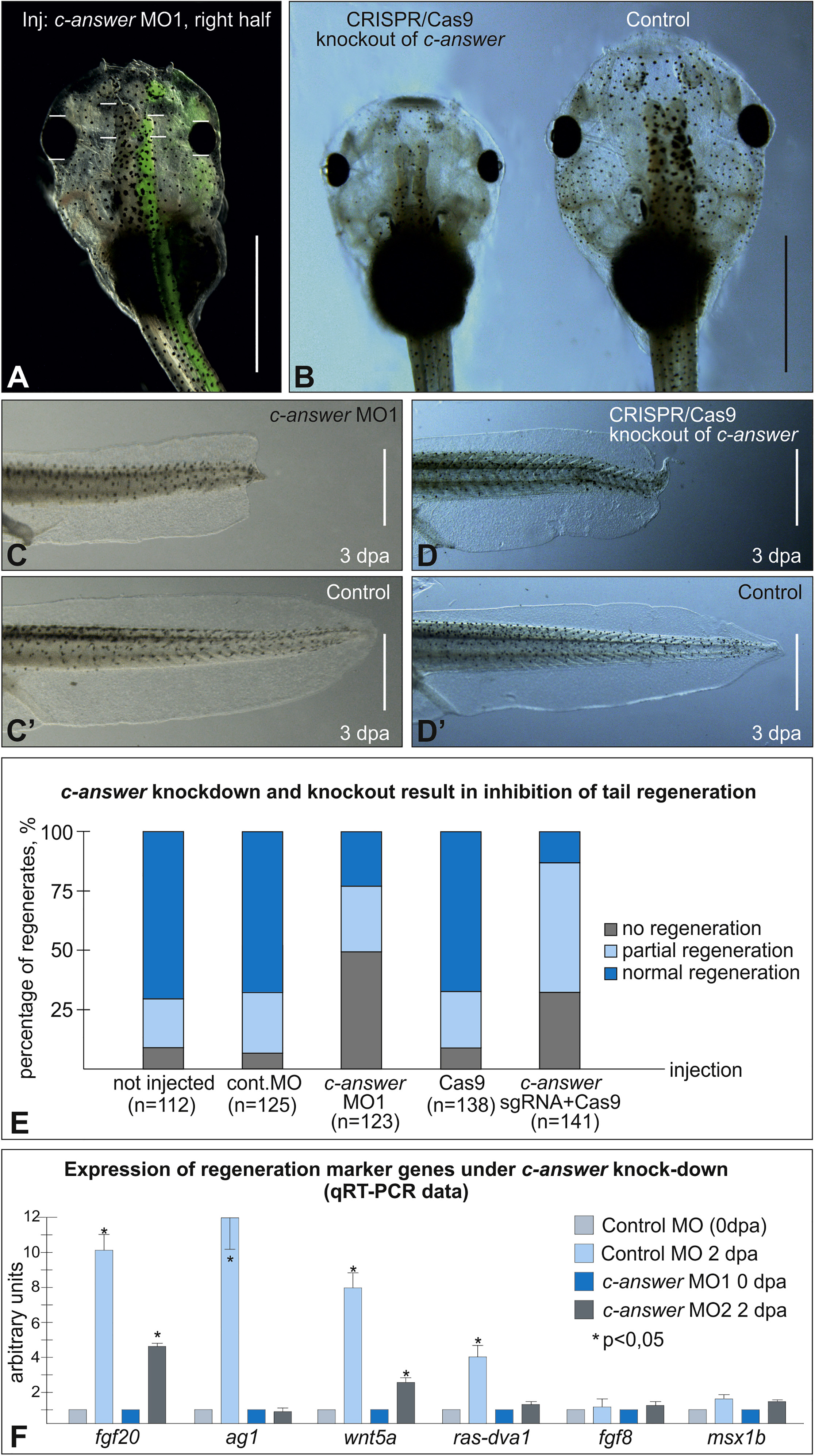 Figure 4. Effects of c-answer Downregulation by Knockdown with Anti-Sense Morpholino Oligonucleotides and the CRISPR/Cas9 Knockout on Tadpole Brain Development and Tail Regeneration (A) c-answer knockdown with c-answer MO1 injections into the dorsal right blastomere at the 4-cell stage results in diminishing of the overall tadpole size, especially of the forebrain and eye (n = 180; 85% morphants), compared to that of the left side (control). Overlay with the fluorescent image demonstrates the distribution of the co-injected tracer FLD. (B) Tadpole in which c-Answer was knocked out in 2nd exon with CRISPR/Cas9 technology has a smaller size then the wild-type tadpole at the same stage. (C, Câ, D, and Dâ) Tail regeneration in tadpoles with c-answer knockdown (C) or knockout (D) is inhibited compared to that of the wild-type control (see E for quantification). (E) Diagram showing the distribution of tail regeneration phenotypes in tadpoles injected with the indicated MO or components of the CRISPR/Cas9 system. (F) Analysis of the indicated marker genes expression by qRT-PCR in tips of the amputated tails of Xenopus laevis tadpoles at stage 41 (see for the scheme of the experiments and for specific primers structures; Ivanova et. al. 2018). The results were normalized by geometric median of odc and ef1alfa housekeeping genes expression described in Ivanova et al. (2013). The expression level of each gene at 0 dpa in the control piece of tissue was taken as one arbitrary unit. Scale bars: 1 mm in (A) and (B) and 250 μm in (C)â(Dâ). Figures S1, S4, S5, and S6. |