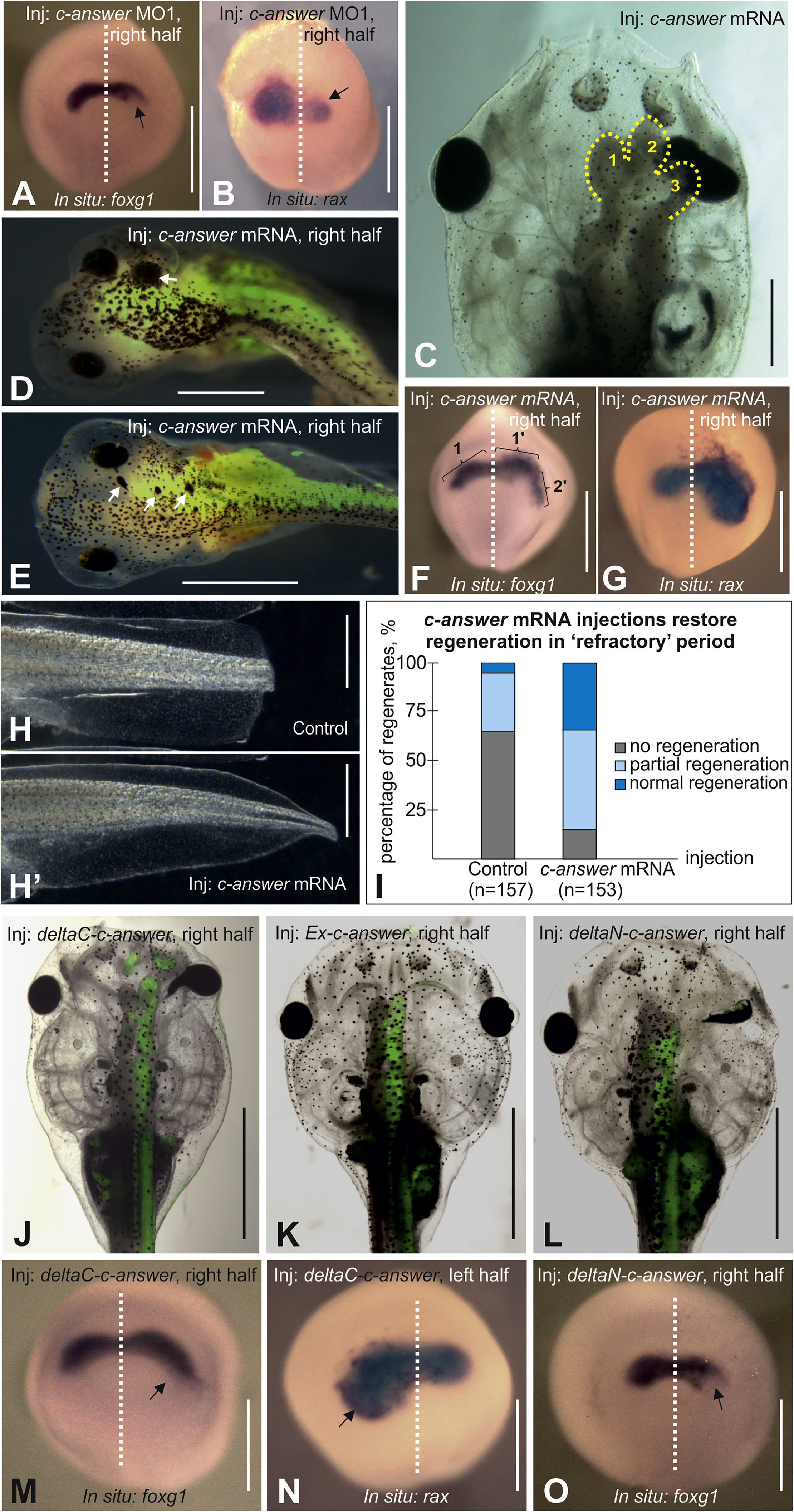 Figure 5. Effects of the Overexpression of c-Answer and Its Deletion Mutants on Tadpole Brain Development and Tail Regeneration (A and B) Inhibition of foxg1 (A) and rax (B) expression on the right side of middle neurula embryos by injection into the right dorsal blastomere at the 4-cell stage. (C) Overexpression of wild-type c-answer results in the development of an ectopic telencephalic hemisphere (3) in addition to normal hemispheres (1 and 2). (D and E) Ectopic eye differentiation in tadpoles overexpressing wild-type c-answer in the form of one normal-sized eye (D) or three small eyes (E). (F and G) Ectopic expression of foxg1 (F) and rax (G) on the right side of middle neurula embryos following the injection of c-answer mRNA into the right dorsal blastomere at the 4-cell stage. (H and Hâ) Overexpression of wild-type c-answer rescues tail regeneration during the ârefractoryâ period (see I for quantification). (I) Diagram showing the distribution of the regenerating tail phenotypes in the control tadpoles and those overexpressing wild-type c-answer. Tails were amputated during the refractory period. (J) Overexpression of the deltaC-c-Answer mutant leads to a telencephalon size increase and ectopic RPE differentiation. (K) Overexpression of the extracellular domain of c-Answer results in a slight increase in the telencephalic and eye size on the injected (right) side. (L) Overexpression of the deltaN-c-Answer mutant inhibits the development of the telencephalon and eye on the injected side. (M and N) Ectopic foxg1 (M) and rax (N) expression on the left side of middle neurula embryos injected with deltaC-c-Answer mRNA into the left dorsal blastomere at the 4-cell stage. (O) Inhibition of foxg1 expression in the lateral part of the endogenous right expression domain of foxg1. Scale bars: 500 μm in (A), (B), (D)â(G), and (M)â(O); 1 mm in (C) and (L); and 250 μm in (H) and (Hâ). See also Figure S7. |
