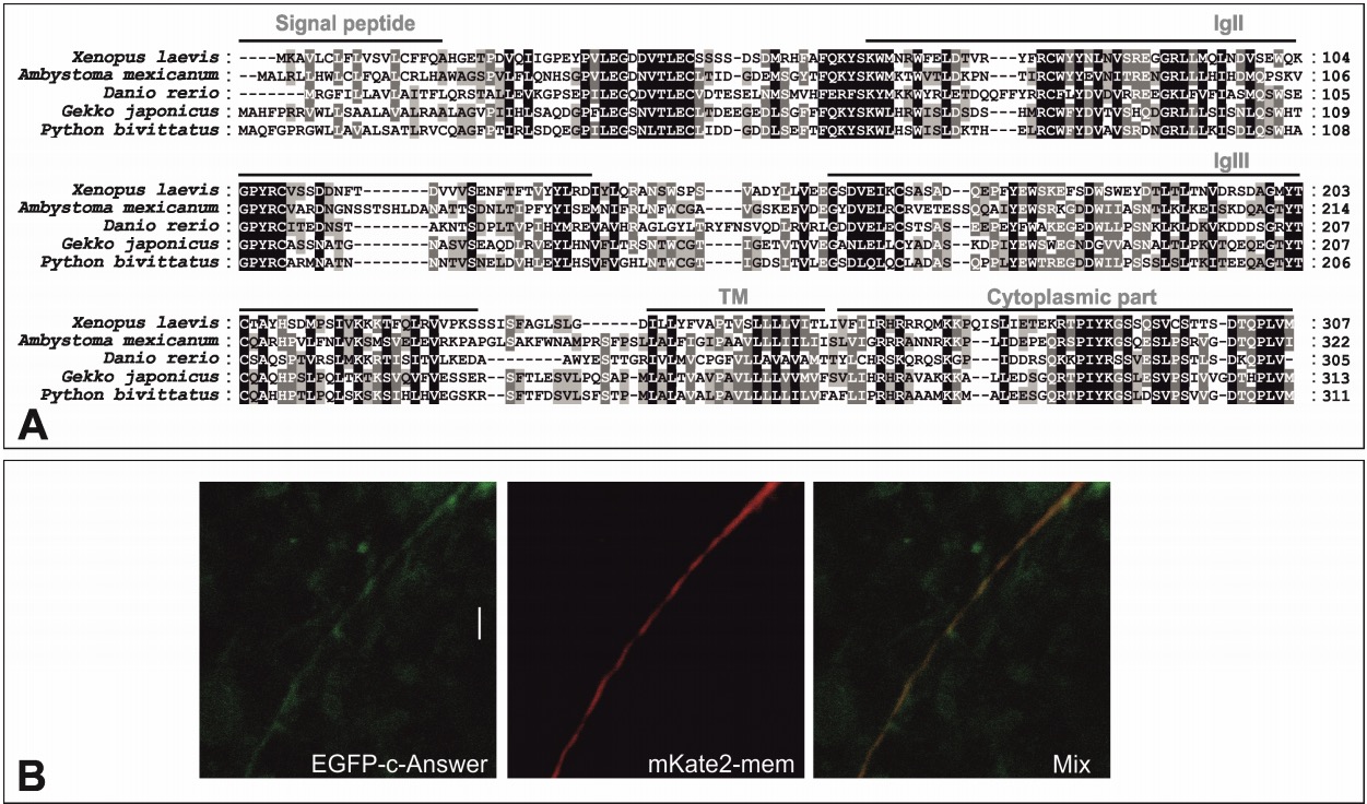 Figure S2. Alignment of c-Answer from different species and its localization in cell membrane, Related to Figure 2. A. Alignment of c-Answer from the indicated could-blooded animals. B. Co-localization of EGFP-c-Answer with cell membrane marker mKate2-mem on cell membrane of the ectodermal cell of Xenopus laevis embryo at the middle gastrula stage. Scale bars on B 200 nm. |