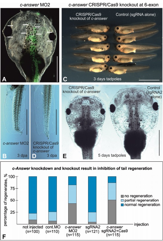 Figure S5. Effects of c-answer downregulation by knockdown with anti-sense morpholino oligonucleotide 2 (MO2) and the CRISPR/Cas9 knockout with sgRNA to the target site in 6th exon on tadpole brain development and tail regeneration, Related to Figure 4. A. c-answer knockdown with c-answer MO2 injections into the dorsal right blastomere at the 4- cell stage results in diminishing of the overall tadpole size, especially of the forebrain and eye, compared to that of the left side (control). Overlay with the fluorescent image demonstrates the distribution of the co-injected tracer FLD. B. Tadpoles in which c-Answer was knocked out in 6th exon with CRISPR/Cas9 technology have smaller size, especially eyes, then the wild-type tadpoles at the same stage. B and D. Tail regeneration in tadpoles with c-answer MO2 knockdown or knockout in 6th exon, respectively, is inhibited compared to that of the wild-type control (see Figure 4). E. Tadpole in which c-Answer was knocked out in 6th exon with CRISPR/Cas9 technology have smaller size then the wild-type tadpoles at the same stage. F. Diagram showing the distribution of tail regeneration phenotypes in tadpoles injected with canswer MO2 or indicated components of the CRISPR/Cas9 system. Scale bars: A, B, D, E 500 µm; C 1mm |